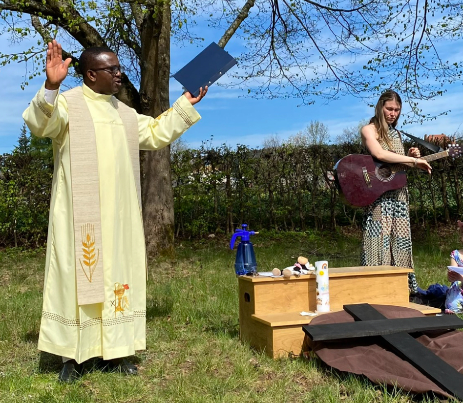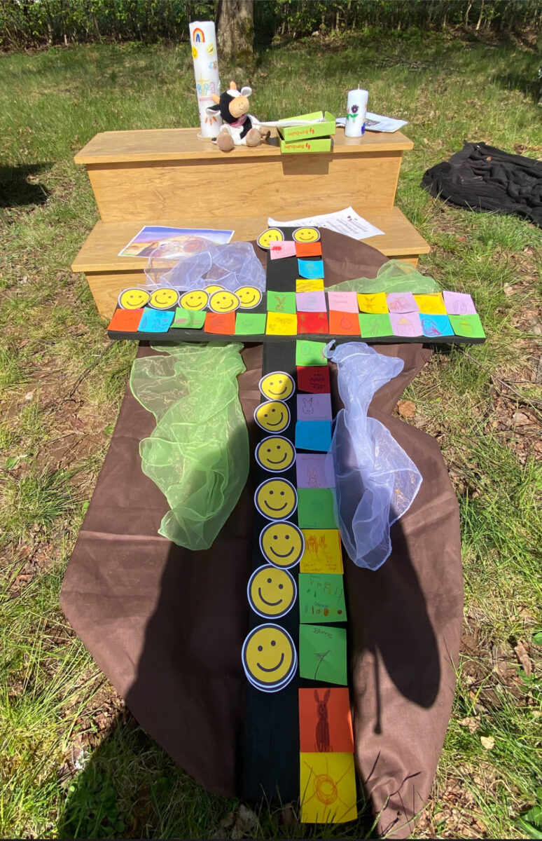 Doch mit großem Eifer gestalteten die Kinder im Laufe der Andacht ein buntes Kreuz in leuchtenden Farben – ein sichtbares Zeichen der Hoffnung und des neuen Lebens. Pfarrvikar Linus spendete zum Abschluss den Segen über die mitgebrachten Osterspeisen und seine Besucher.