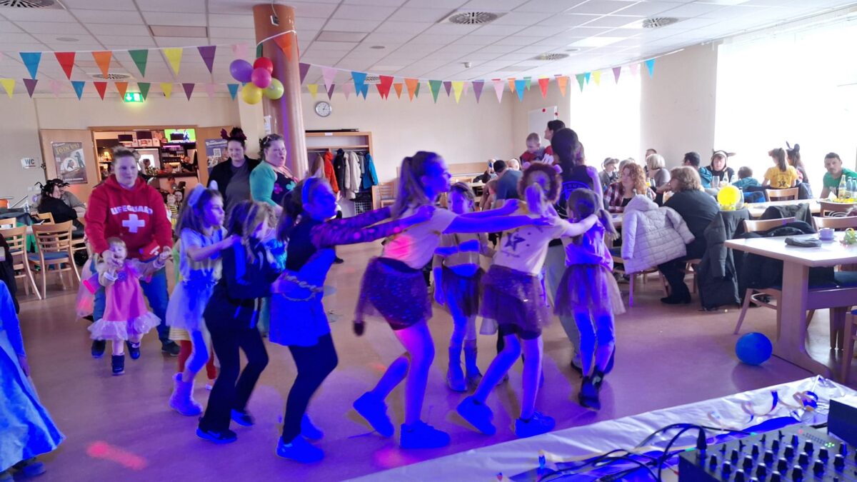Nach so viel Bewegung war es Zeit für eine wohlverdiente Pause. Dafür sorgte das lange Kuchenbuffet, das mit 24 liebevoll verzierten Kuchen und Torten lockte. Hier gab es für jeden Geschmack etwas und die verbrauchte Energie konnte schnell wieder aufgefüllt werden. Gestärkt ging es dann weiter zum Tanzen. “Der Zug, der Zug, der Zug hat keine Bremse”, ertönte es durch den Veranstaltungsraum, während ein langer Zug aus tanzenden Kindern und Erwachsenen sich seinen Weg bahnte. Besonders die kleineren Faschingsfans lebten beim “Körpterteileblues” so richtig auf.