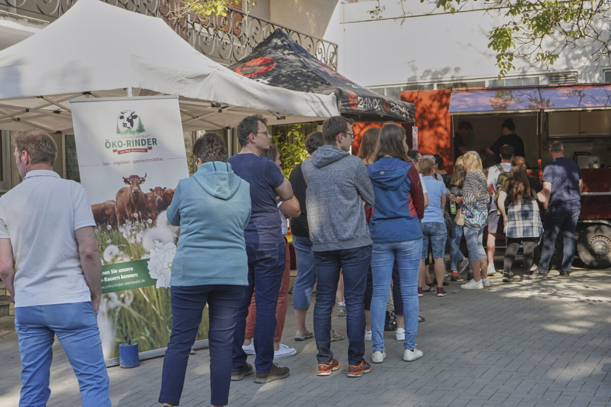 Mit diesem Ansturm haben die Planer und Veranstalter tatsächlich nicht gerechnet. Das Wetter passte und so hatten die Burger-Griller alle Hände voll zu tun. Doch die Schlange vor dem Grillwagen wurde vor allem mittags und abends kaum kürzer. Dreierlei Bio-Burger-Varianten standen auf der Speisekarte: klassisch mit Tomate-Gurke-Salatblatt, Tomate-Mozzarella und der deftige Beef & Bacon-Burger mit glasierten Zwiebeln. Etwa 600 Bio-Burger wurden bis zum Ende des Tages gegrillt.