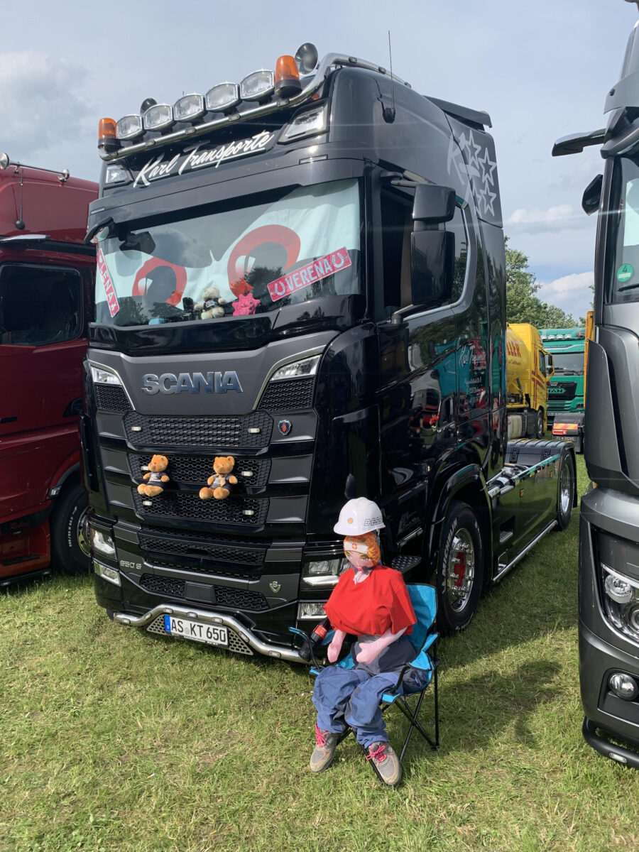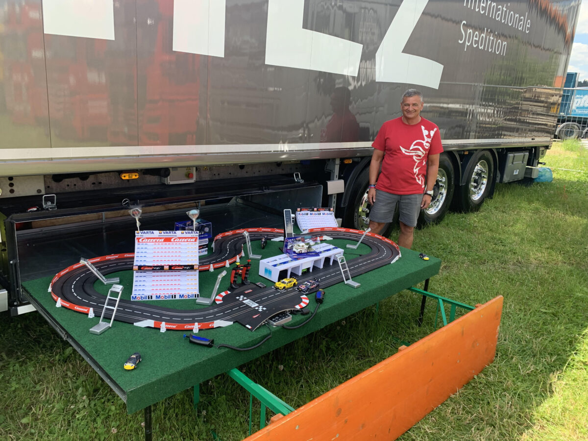 Die „Bäären-Bande“ war mit 20 Fahrzeugen am stärksten vertreten. Sie installierten sogar einen Swimming-Pool auf ihren Auflieger. „Nur aus Jux und Tollerei“, so Vorsitzender Torsten Schmitt der „Bäären-Bande“. So auch Georg Reißig aus Deggendorf, der in seinem Lkw eine ausfahrbare Carrera-Bahn eingebaut hat. Sie wurde im April erstmals bei einem Benefiztreffen vorgestellt und die Besucherkinder dürfen diese auch benutzen.