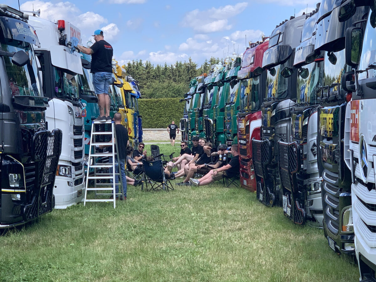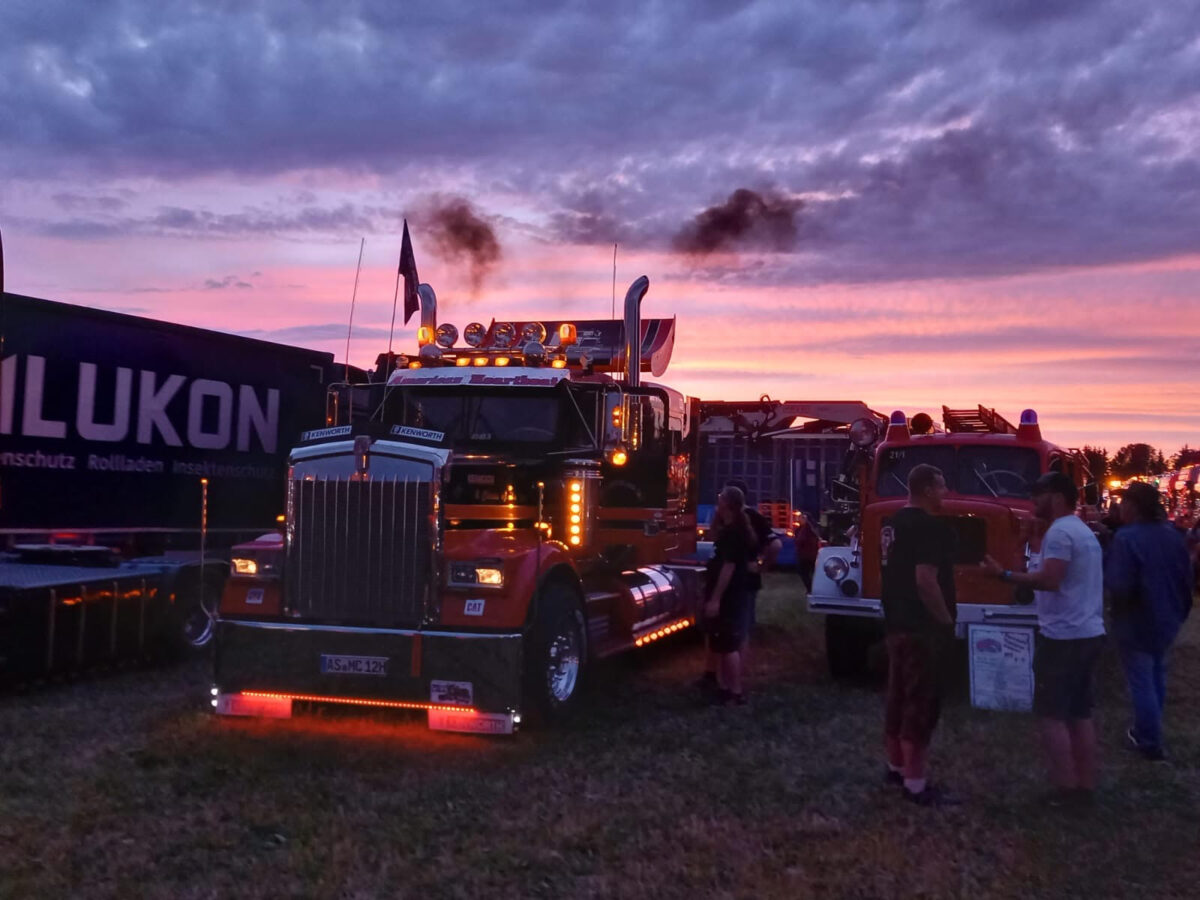 Der Freitagabend begann mit zwei Kult DJx. Unter dem Motto 90er-Party heizten DC DC & DJ D-Kay die Besucher bis in den Morgenstunden ein. Bei Einbruch der Dunkelheit durfte natürlich auch die Lichtershow nicht fehlen. Über 100 Lkws schalteten ihre kompletten Lichter ihrer Trucks ein und beleuchteten somit das gesamte Arenal rund um die O`Schnitthalle. Gänsehautfeeling pur, das auch am Samstag wiederholt wurde. Normalerweise gehört auch ein Hupkonzert dazu, auf das aber wegen der Nähe zum Dorf verzichtet wurde. Die „brave“ Truckerfamilie hielt sich fast ausnahmslos daran.