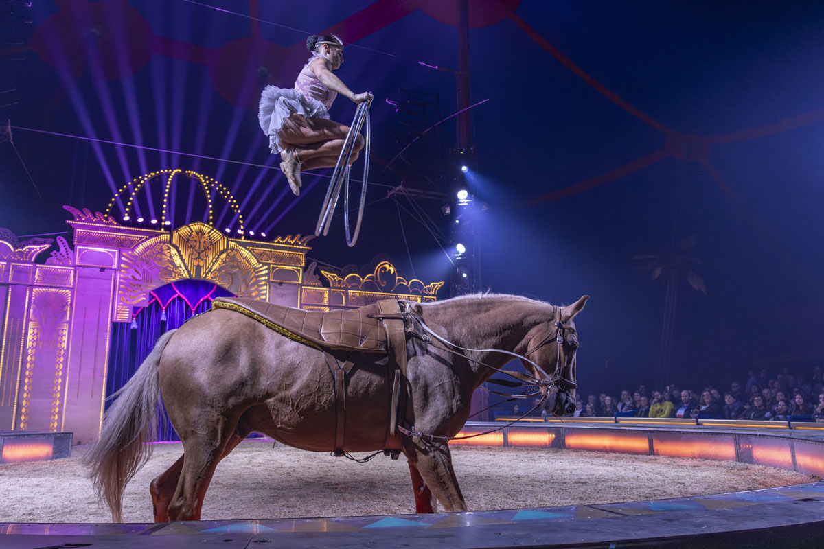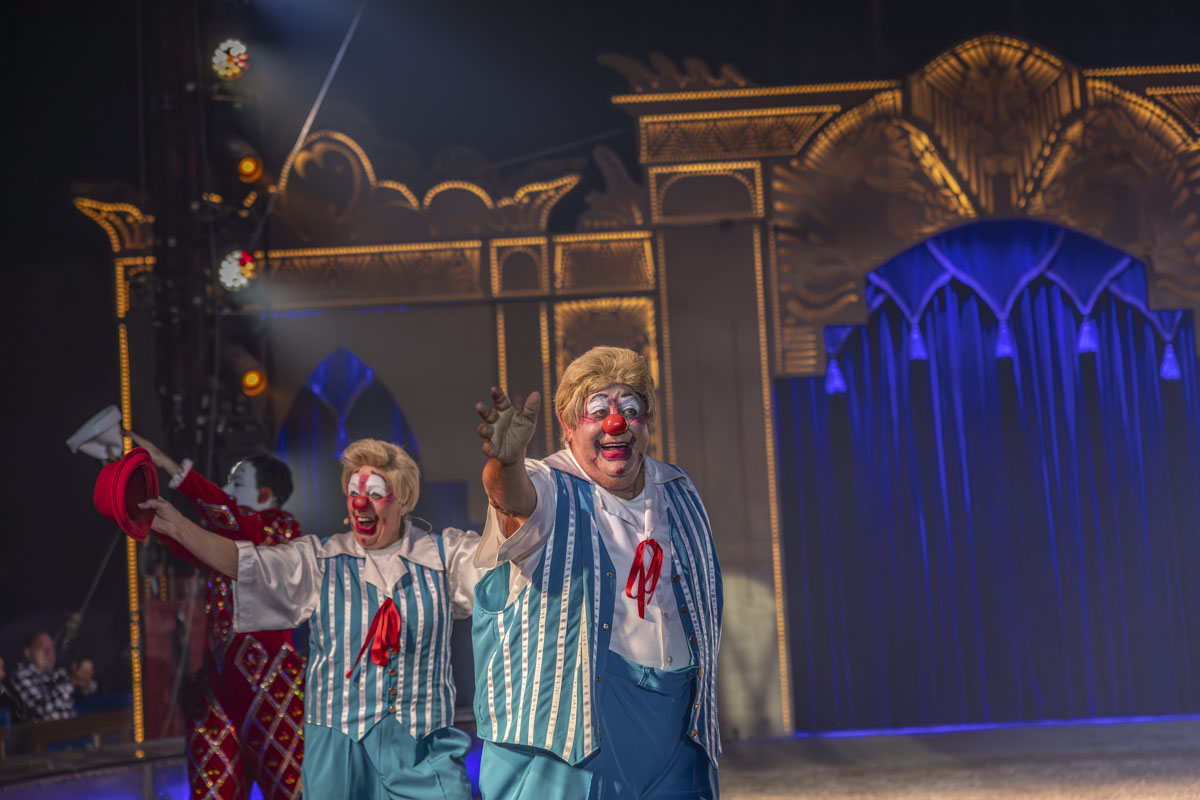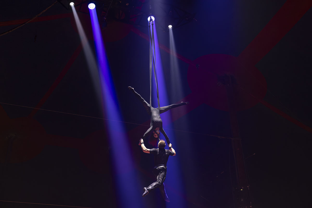 Oder auch das spektakuläre Duo “Flash of Splash”. Die Luftakrobaten verschmelzen an Strapaten in der Luft. Sie begeben sich – wie die Todesrad-Artisten “Mustafa Danguir” aus Marokko – in Lebensgefahr. 2019 konnte Amaliaa Avanesian bei einem Auftritt in Bielefeld das Tau mit ihrem Partner nicht im Mund halten. Yevhen Abakumov stürzte sechs Meter in die Tiefe. Drei Monate später standen sie wieder in der Manege. Die Ukrainerin und der Russe haben bewiesen, dass es immer wieder irgendwie weitergeht.