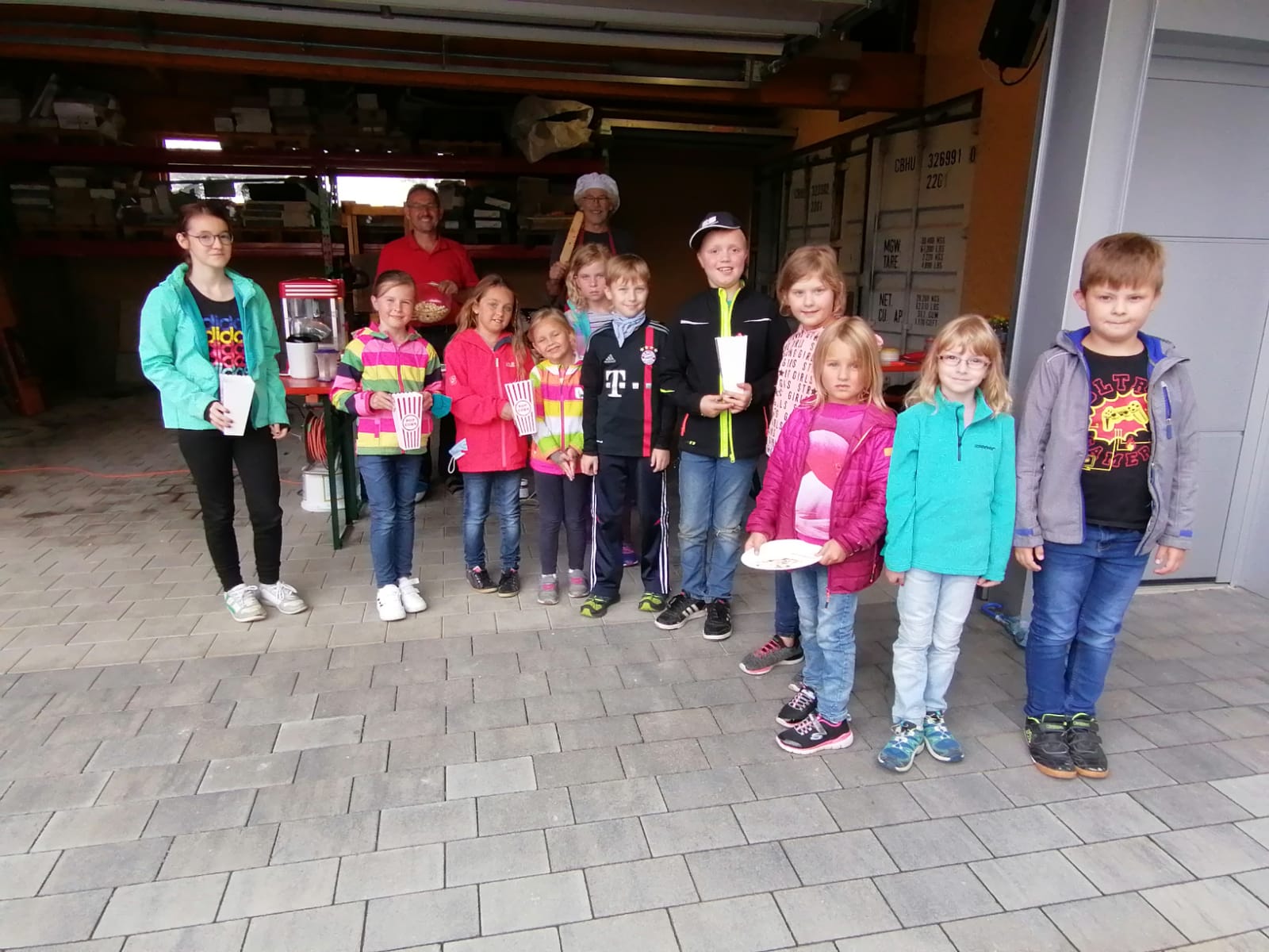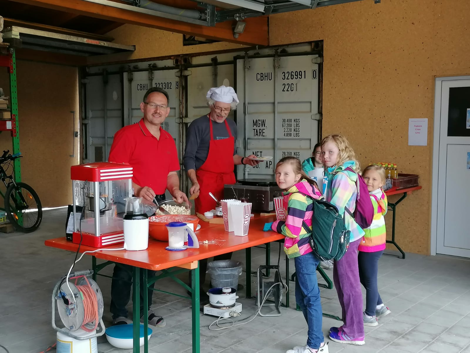 Die Kinder waren vorher im Erlebnisgarten, Beate Spickenreuther und Martina Heimann begleiteten sie von dort ins warme „Kino“. Dort gab es erst einmal etwas zu essen; Josef Herrlein servierte frische Crêpes, Karl-Heinz Mois selbst gemachtes Popcorn.
