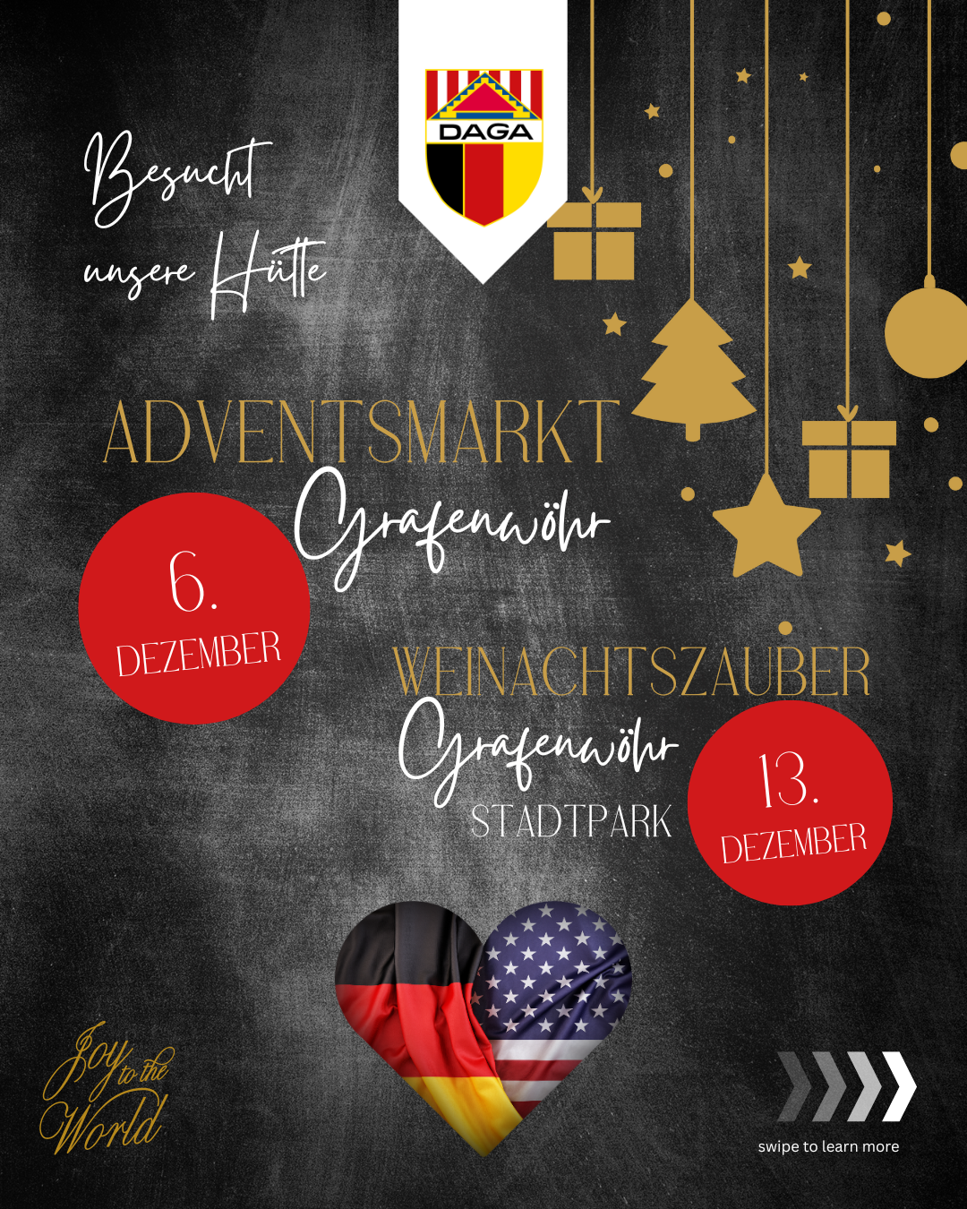 Wer den DAGA unterstützen möchte, hat noch dieses Jahr die Gelegenheit dazu: Der DAGA ist am 6. Dezember mit einer Hütte auf dem Adventsmarkt Grafenwöhr vertreten und lädt am 13. Dezember zum Besuch des DAGA-Stands beim Weihnachtszauber im Stadtpark Grafenwöhr ein. Bei beiden Veranstaltungen können Besucher Glühwein und Punsch aus der Region sowie heiße Cocktails und mehr genießen – eine perfekte Gelegenheit, die Gemeinschaft zu stärken und Gutes zu tun.