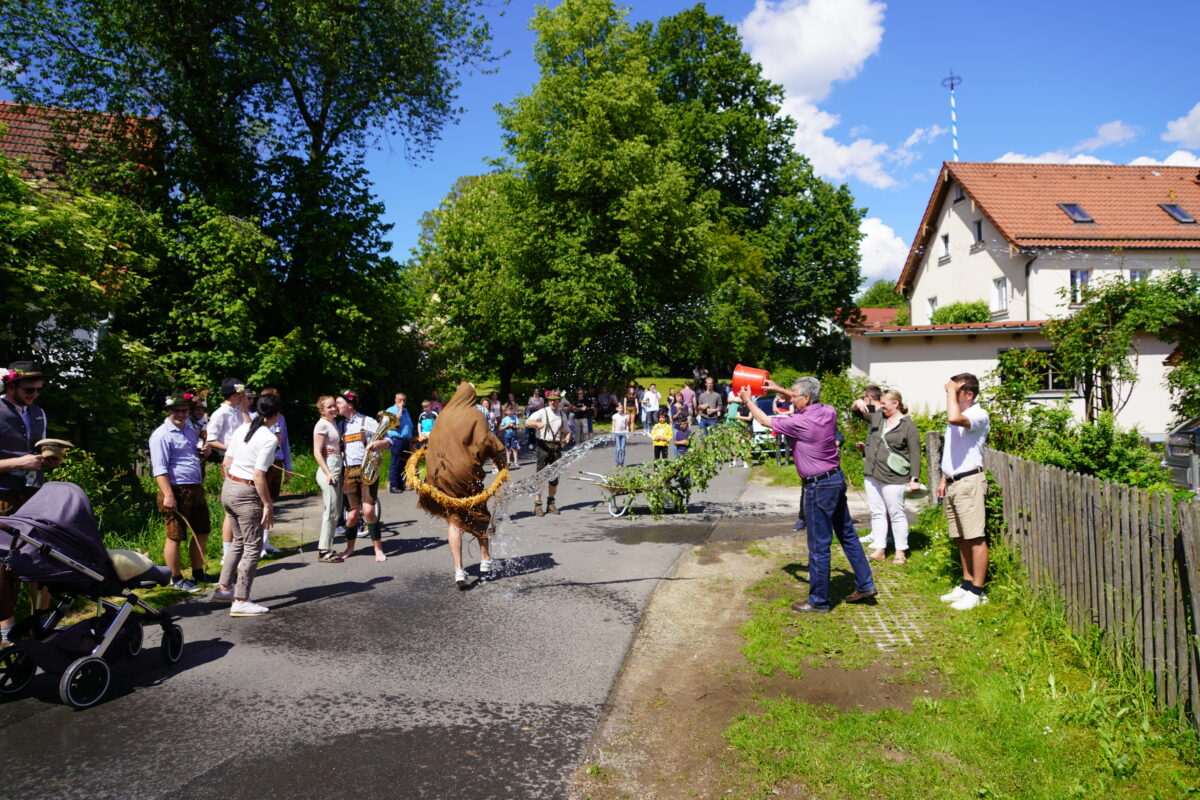 Obendrein wurde das tanzende Opfer mit Wasser begossen um den springenden, juchzenden und nassen „Irgendjemand“ für seine Faulheit und sein Langschläfertum zu bestrafen. Der arme Tropf war außer mit einer Badehose einzig und allein mit dem tropfnassen Jutesack bekleidet. Und wenn er mal nicht begossen und tanzen musste – lag er auf einen alten Mistkarren und wurde voller Schadenfreude von Haus zu Haus geschoben. Gut meinte es bei strahlendem Sonnenschein der Pfingstmontags – Wettergott mit dem „Faulen Sack“.