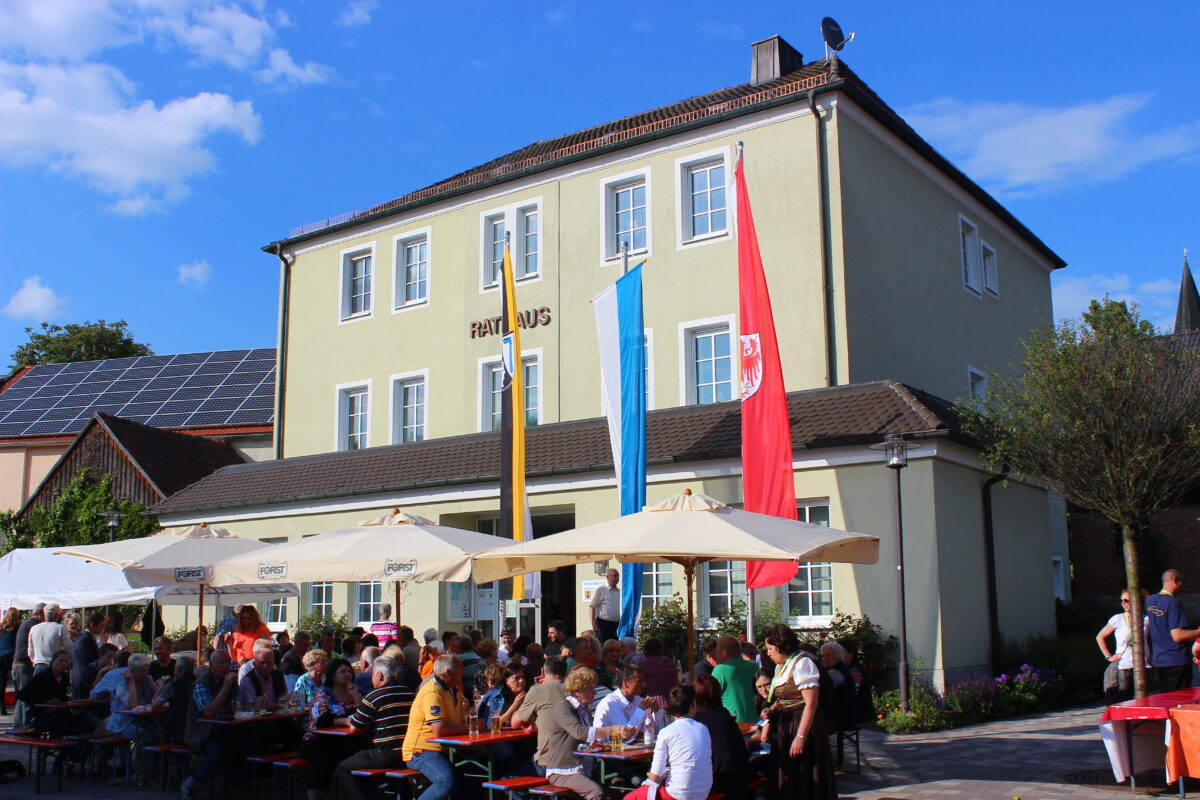 Südtiroler Spezialitäten zieren die Getränke und Speisekarte in der Zeit von 14 bis 19 Uhr auf dem Terrain vor dem Rathaus. Im einzelnen Tiroler Speck und Käse, Vinschgauer, Original Südtiroler Krapfen, Weine der Meraner Kellerei Marling dazu Bierspezialitäten der in Algund ansässigen Brauerei Forst.