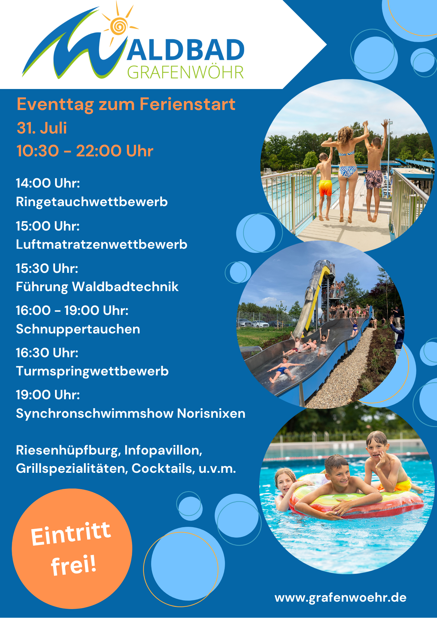 Zum Sommerferienstart wartet am Donnerstag, 31. Juli, ein Aktionstag voller Spiele, Wettbewerbe und anderer Attraktionen auf die Besucher. An diesem Tag öffnet das Waldbad um 10.30 Uhr und bleibt bei gutem Wetter bis 22 Uhr geöffnet. Der Eintritt ist frei, Kinder erhalten zusätzlich einen Gutschein für ein Eis. Über den Tag gibt es viele Wettbewerbe: Wer zeigt die coolsten Sprünge vom Sprungturm? Wer taucht die meisten Ringe vom Beckenboden an die Oberfläche? Wer kann am schnellsten auf einer Luftmatratze paddeln? Alle Teilnehmer dürfen sich über schöne Preise freuen.