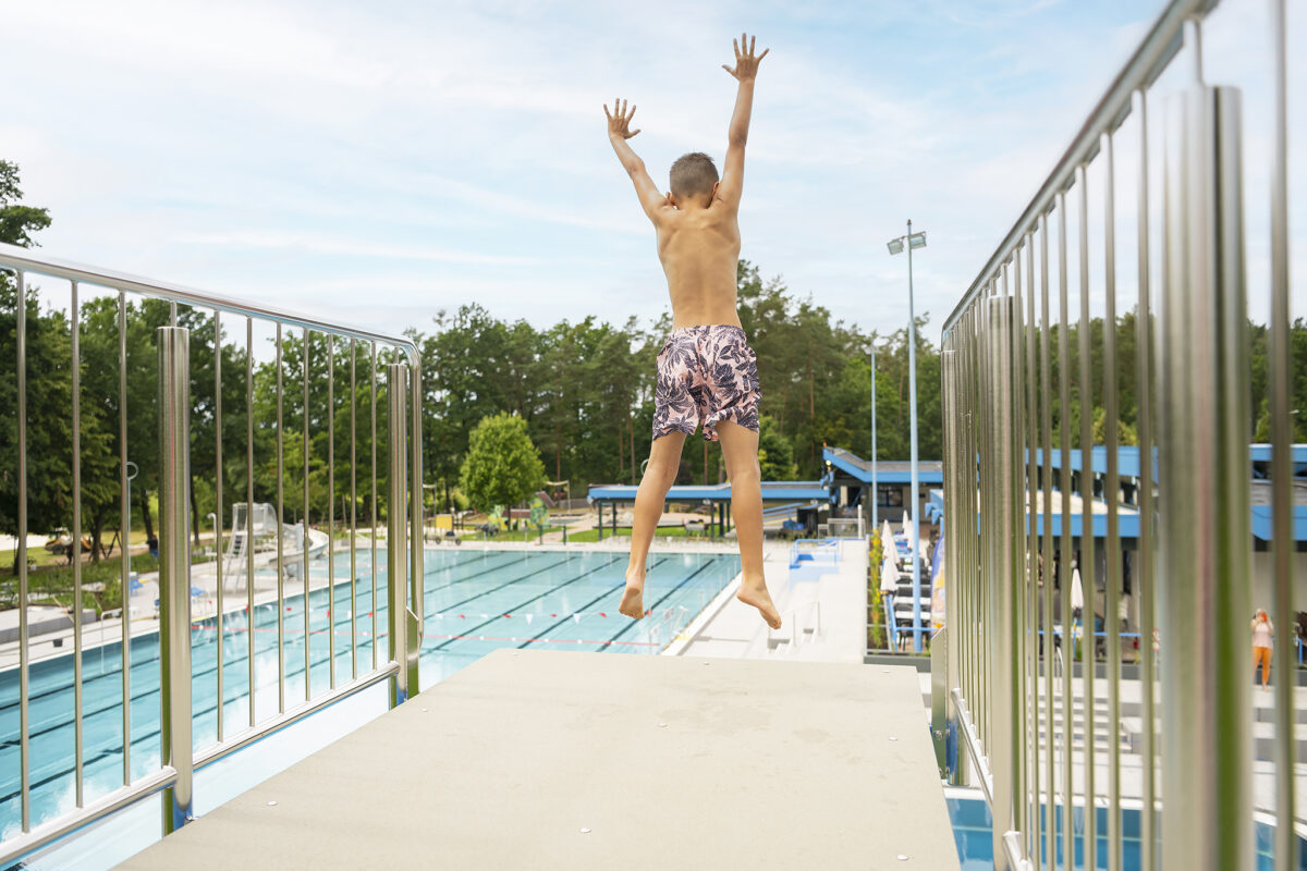 Mit dem zweiten Sanierungsschritt wurde im vergangenen September nach Saisonende begonnen. Und obwohl die Bauarbeiten wesentlich umfangreicher waren, gingen sie in Rekordtempo vonstatten, weshalb das Waldbad Grafenwöhr mit nur leichter Verspätung in die Sommersaison 2025 starten kann. Ein wettkampftaugliches, komplett neues 50-Meter-Edelstahlbecken beinhaltet Schwimmbahnen, einen Nichtschwimmer- und einen Sprungbereich mit 1-, 3- und 5-Meter-Plattformen. Auch eine neue Kinderrutsche führt jetzt ins Becken. Modernisiert wurde zudem das Umfeld der Becken ebenso wie die Sanitäranlagen.