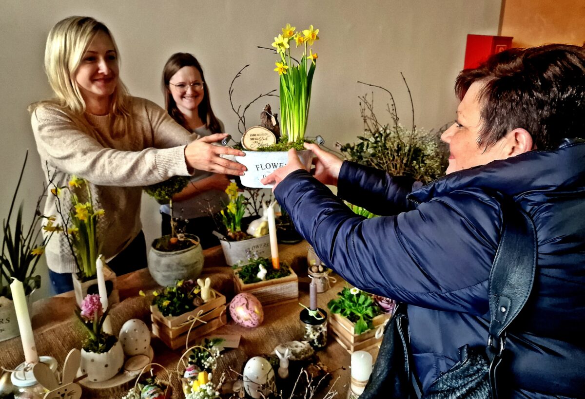 Beim Rundgang reihte sich Stand an Stand von herrlichen Blumendekorationen mit Primeln, Krokusse, Narzissen und tollen Floristikgestecken, Gartenstecker, Natur- und Holzdekoration bis hin zu Filztaschen, Kerzen, Kissen und Krügen und Selbstgenähtem, sogar Vogelnistkästen und gelaserte Leuchten wurden präsentiert.