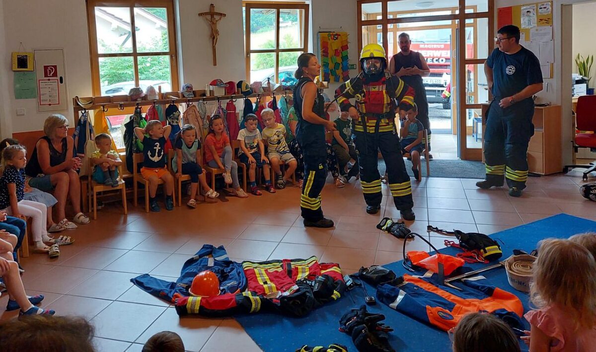 Mit Blaulicht und Sirene kam die Feuerwehr an, denn zuvor wurde im Haus der Feueralarm ausgelöst. Dann wurde gleich mit der Kindergartenleiterin Anita Wittmann und dem ganzen Team die Evakuierung geübt und damit ein Brandfall nachgestellt. Anschließend erklärte das Wehr-Trio den Kindern sehr anschaulich die Ausrüstung der Feuerwehr.
