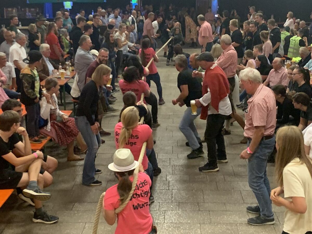 Beim Seilziehturnier am Abend siegten die Waidhauser Seilzieher auf ganzer Ebene. Zunächst gewannen deren Frauen gegen die „Se(x)chs richtigen“ aus Wurz und dann die Männer gegen den Sportverein Wurz. Die nahmen es sportlich und so wurde anschließend gemeinsam bei der After-O’Schnitt-Party in der Bar gefeiert. Bei den Herren bekamen die Sieger 50, 30 und 20 Liter Biergutscheine. Die Damenmannschaften durften Bargutscheine in Empfang nehmen.