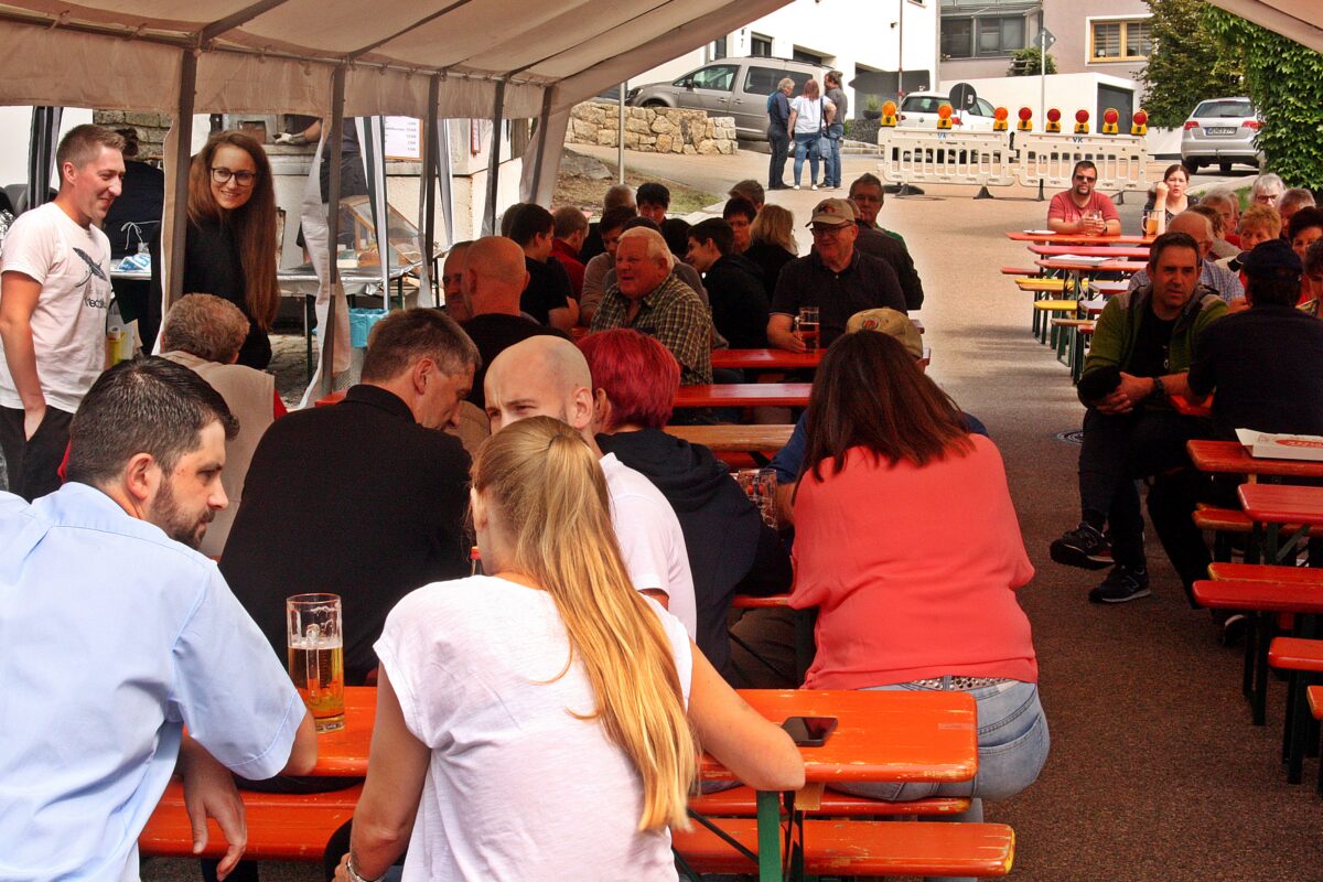 Mittag blieb zum Essen in vielen Familien der eigene Herd ausgeschaltet. Die Helfer am Grillstand waren gefordert. Am begehrtesten war der Spanferkelbraten. Nebenbei gab es auch viele Grillspezialitäten. Zwei aufgestellte Zelte und der Raum im Feuerwehrhaus diente den Gästen und Besuchern als Kommunikations- und Geselligkeitsraum. Am Nachmittag zur Kaffeepause war kaum ein freies Plätzchen zu finden. Für die Kinder war Kurzweil mit einer aufgebauten Hüpfburg, einem Stand zum Dosenwerfen und Kinderschminken angesagt.