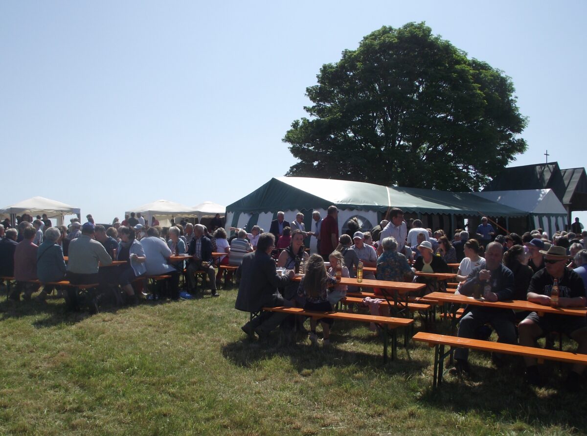 Nach dem Gottesdienst blieb man bei sommerlichen Temperaturen zum Frühschoppen und darüber hinaus sitzen. Man genoss nicht nur die herrliche Fernsicht, sondern auch Kaffee und selbstgebackene Kuchen sowie frische Getränke und das angebotene Grillgut. Im Zelt und auch im Freien rund herum, gab es kaum mehr einen freien Platz.