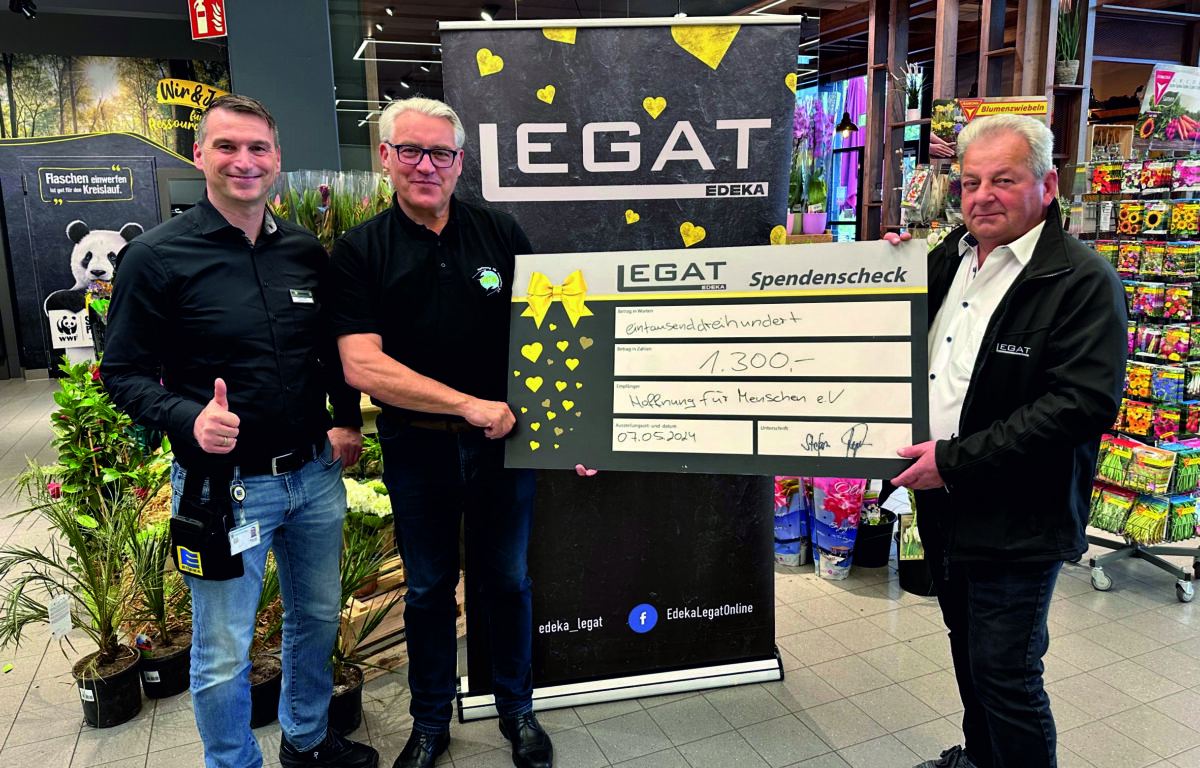Eine weitere Aktion unterstützte den Verein Hoffnung für Menschen e. V. Dabei waren erneut Stefan Legat sowie Thomas Ebnet, der erste Vorsitzende des Vereins, und Manfred Reber, Mitglied des Vereins, zugegen. Diese Sammelaktion lief vom 6. April bis zum 4. Mai. Hier konnten in den EDEKA Legat Geschäften Pfandbons im Gesamtwert von 1.300 Euro gesammelt werden. Zusätzlich wurden aus mehreren Grill-Aktionen vor den Märkten weitere 1.300 Euro erzielt.