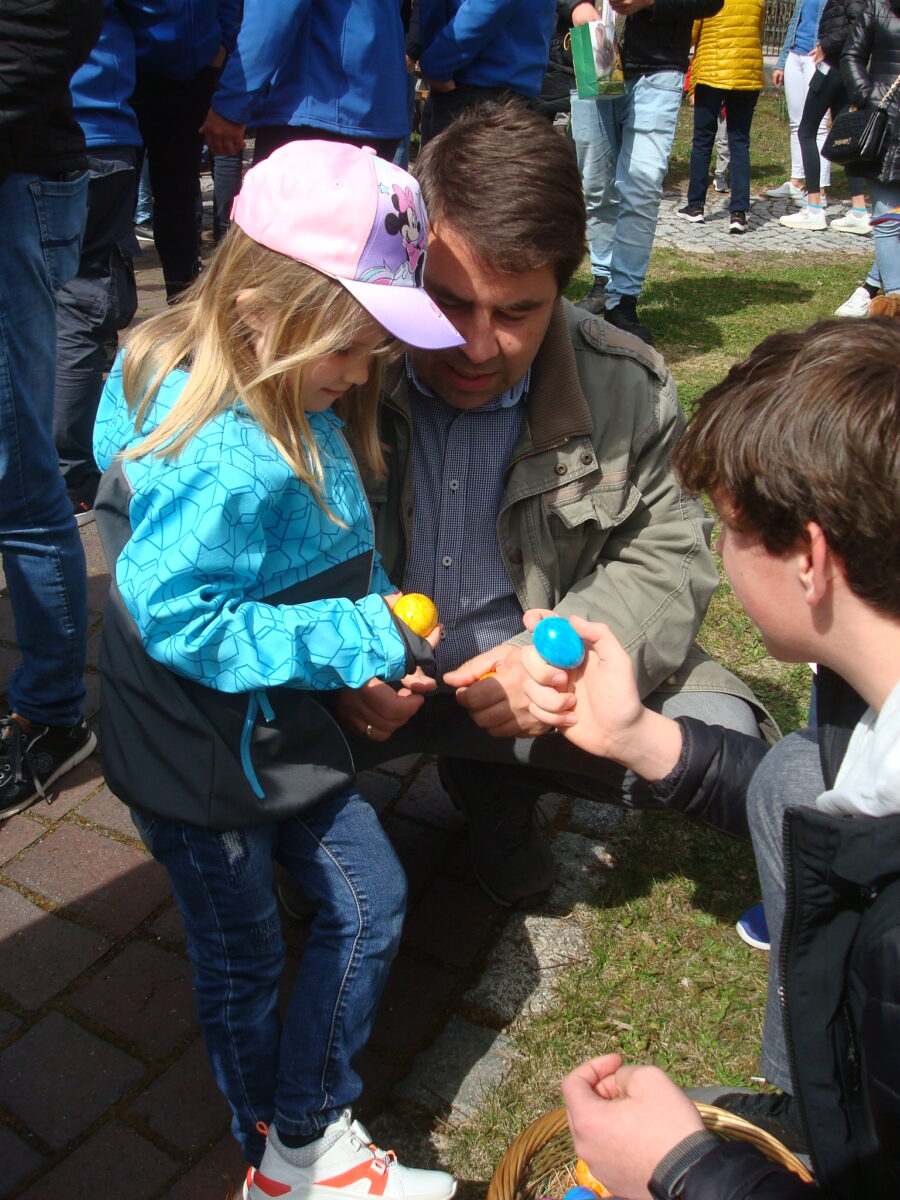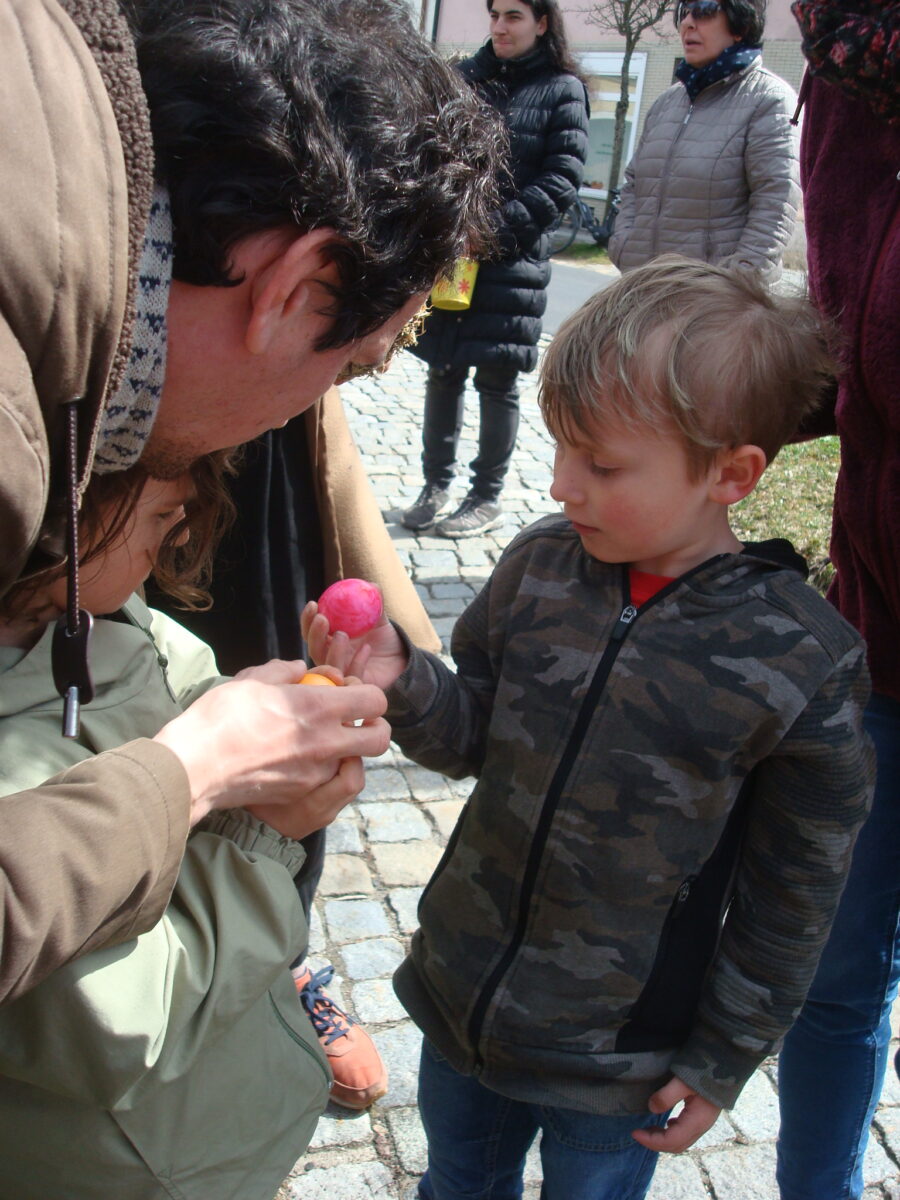Die Stadt Mitterteich hatte dafür extra den Brunnen wieder mit Ostereiern geschmückt. Der Burschenverein steuerte zwei Körbe mit bunten Ostereiern bei. Hier durfte sich jeder bedienen, der selbst keine Eier mit Eierhärtn mitgebracht hatte. Zusätzlich gab es einen Korb voll mit Süßigkeiten für die Kinder.