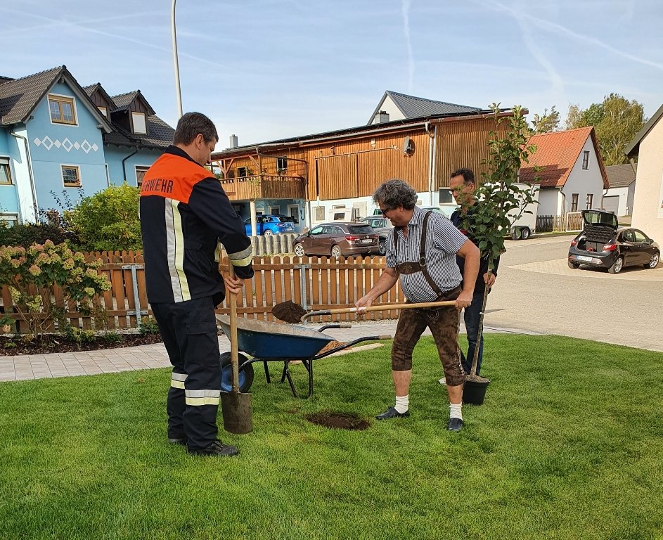 Dießfurt. Bürgermeister Bernhard Stangl, Feuerwehr-Vorsitzender Hermann Lorenz und 16 Feuerwehrleute freuten sich über eine gemeinsame Baumpflanzaktion. Während Bürgermeister und Feuerwehr-Vorsitzender das Loch gruben, legten die Wehrleute einen Schlauch zur Bewässerung.