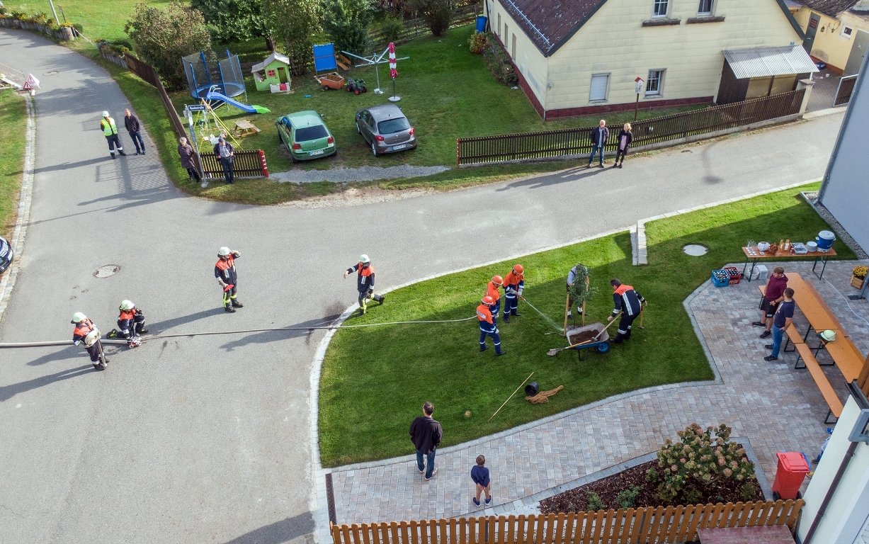 Die Feuerwehrleute Dießfurt begleiteten die Aktion mit einer Übung: Sie entnahmen am Schlossweiher Wasser mittels einer Pumpe und legten einen Schlauch zum neuen Baum. An der Aktion beteiligten sich 16 Feuerwehrleute einschließlich Kommandant Konrad Helgert, der die Aktion leitete.