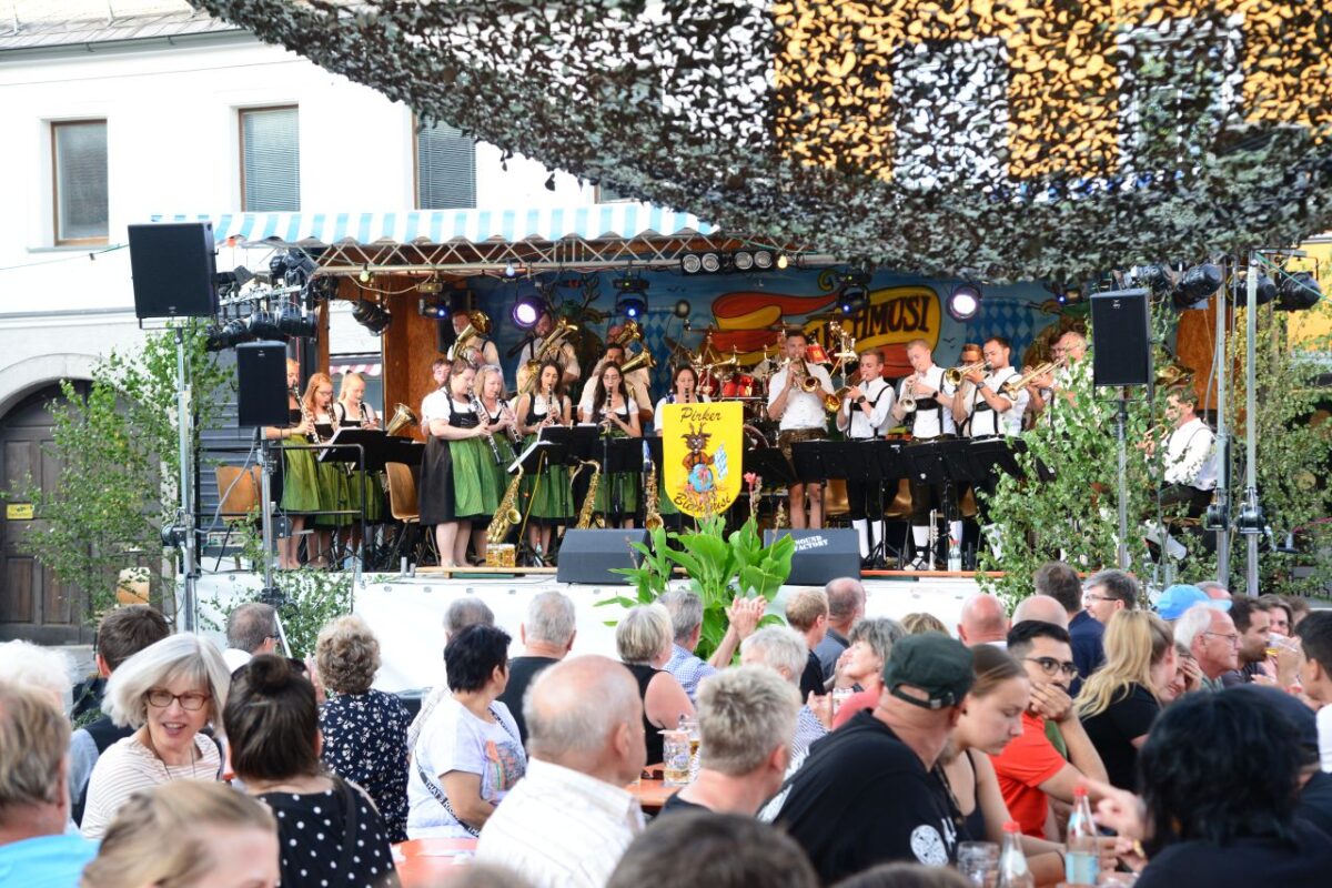 Um 14 Uhr übernahm die Rüscherl Muse die Unterhaltung, was auch bestens gelang, sodass schon am späten Nachmittag vereinzelt der Platz vor dem Rathaus zum Tanzboden wurde. Am Abend übernahm die „Pirker Blechmusi“ den Ausklang des Bürgerfestes. Hier wurden Erinnerungen an Ernst Mosch wach und auch sie hatte den „Böhmischen Traum“ und „Dem Land Tirol die Treue“ in ihrem Programm.