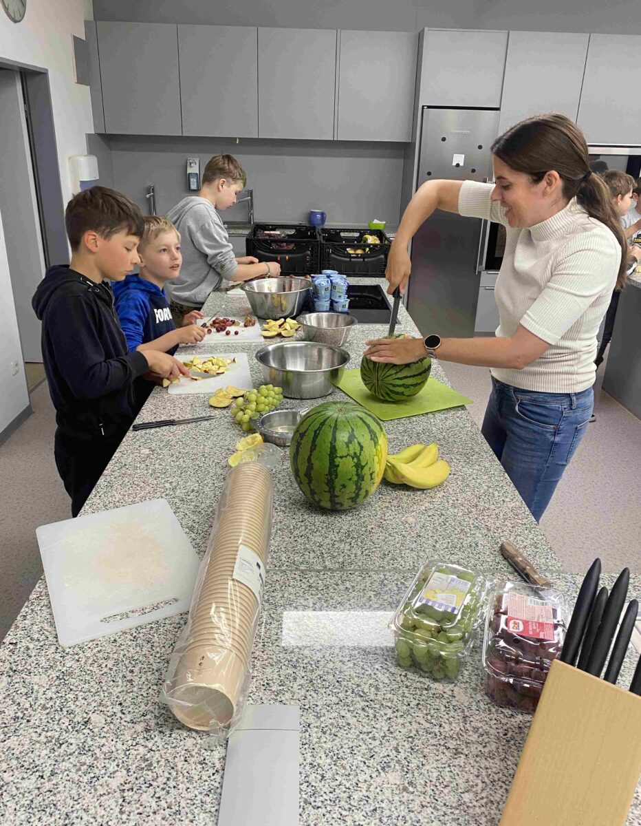 Die Auswahl am Buffet war groß und gesund: Gemüsesticks, Käsespieße mit Weintrauben, verschiedenes Obst wie Bananen, Trauben und Melone, dazu Obstsalat mit Joghurt. Für die nötige Energie sorgten Vollkornbrote und -semmeln mit vielfältigen Belägen sowie frisch gebackene, duftende Waffeln. Nicht zu vergessen die Getränke – Wasser, Apfelsaft, Früchtetee, Milch und Kakao standen bereit, um den Durst der Kinder zu stillen und ihre Flüssigkeitsdepots aufzufüllen.