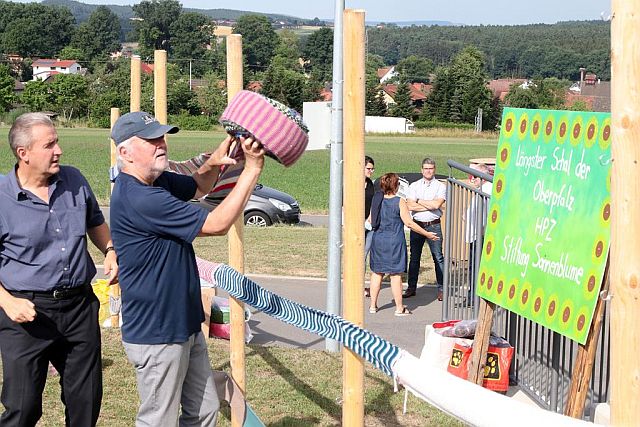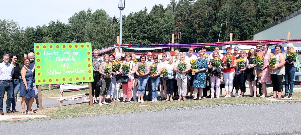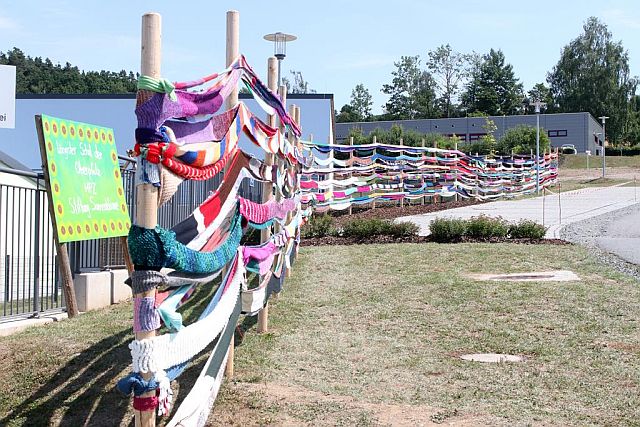 Ist das ein neuer Zaun für das Kinder- und Jugendwohnen „Am Kleefeld“ im Heilpädagogischen Zentrum (HPZ) Irchenrieth? Es ist weder eine Baumaß noch eine Verpackungsaktion eines bekannten Künstlers. Vielmehr schmückt seit Donnerstagmittag der definitiv längste Schal der Oberpfalz die neue Einrichtung.