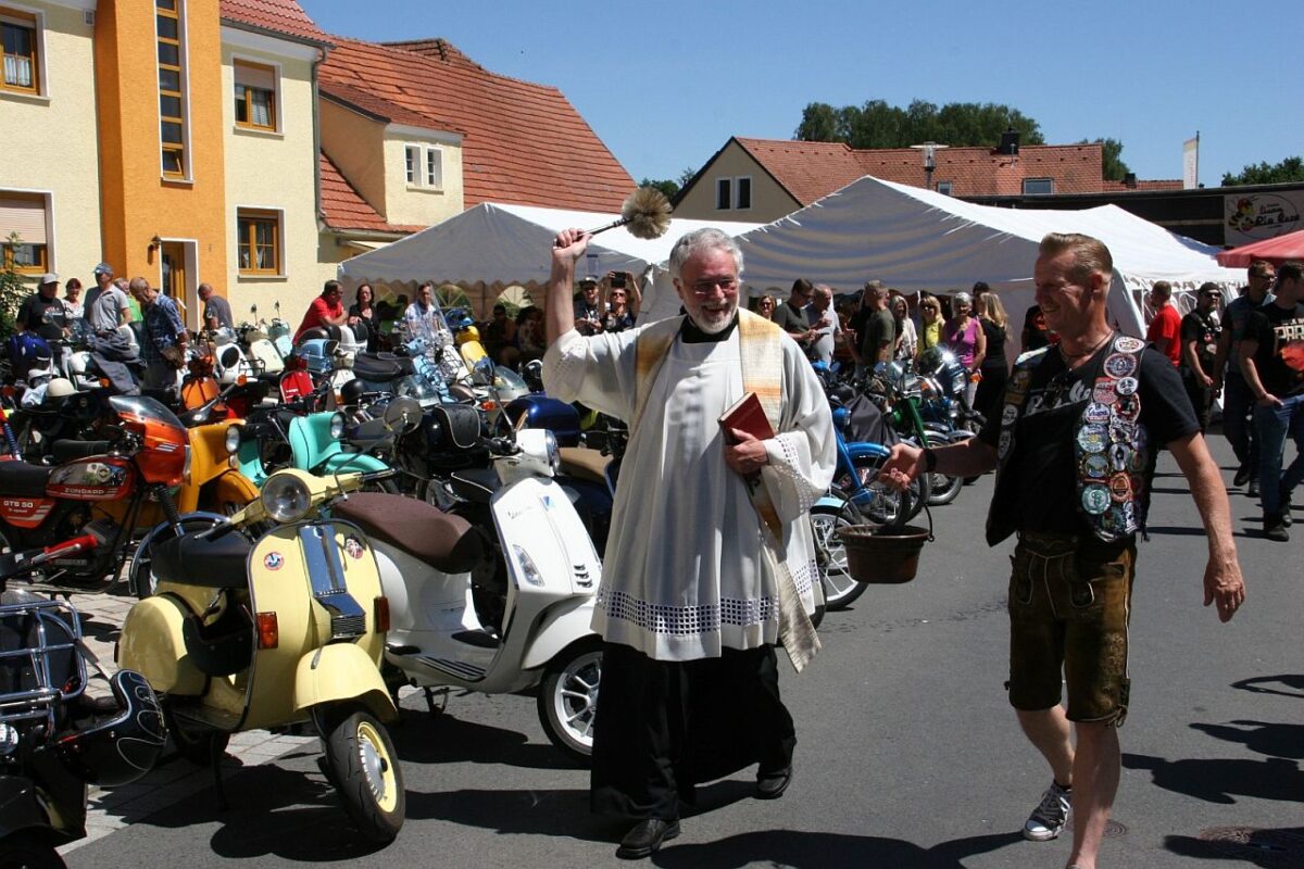 Gesegnet wurden die Blechgefährten Sonntag Mittag durch den Stadtpfarrer Edmund Prechtl, danach begrüßte der Bürgermeister Thorsten Hallmann die Anwesenden. Im Anschluss wurde die Band Downlookers mit den „Vespen“ zur Bühne gefahren. Mit Rock, Funk, Soul und Blues wurde die Tanzfläche noch einmal zum Beben gebracht.