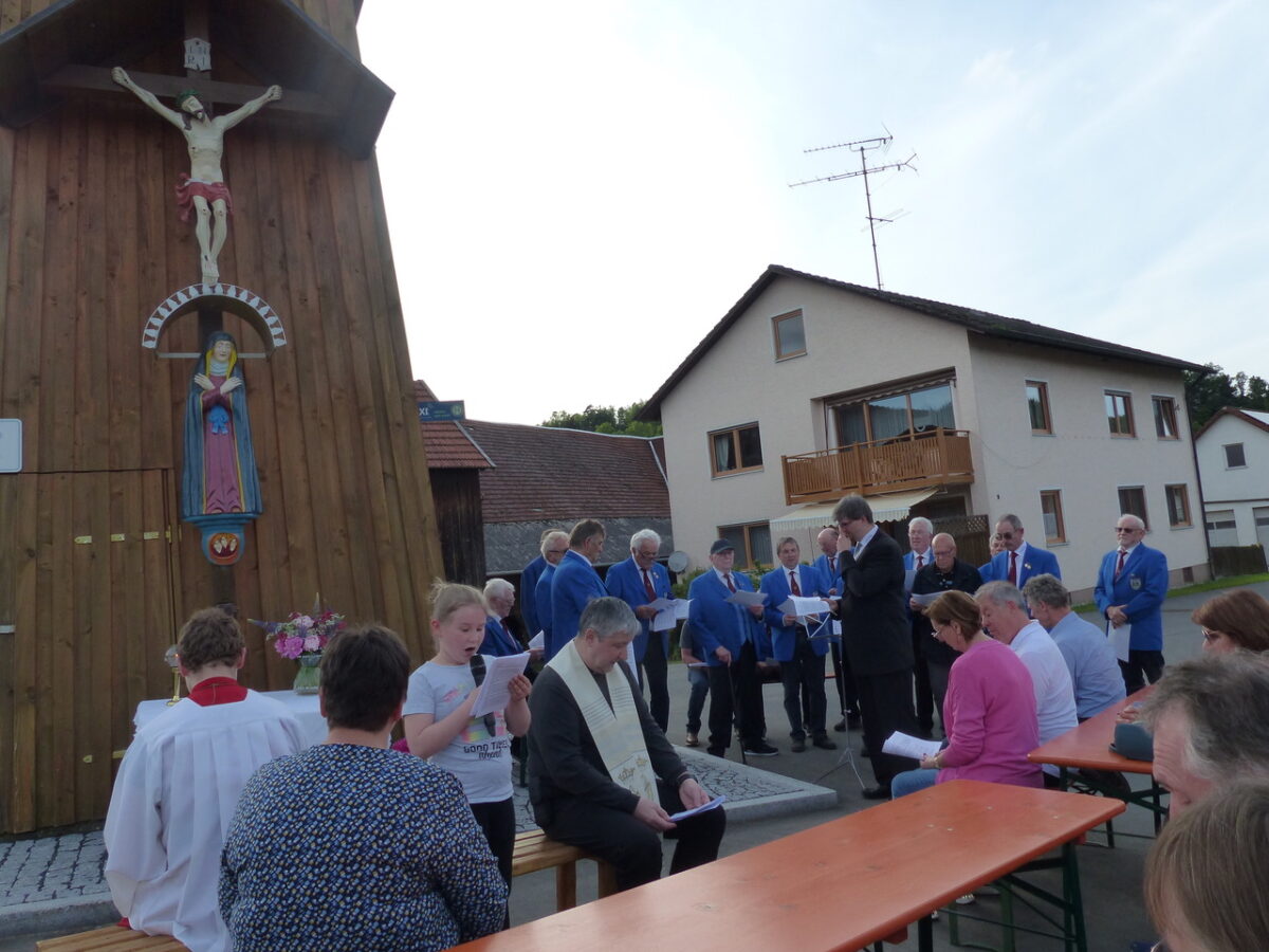 Musikalisch wurde die Maiandacht vom Männergesangverein „Liederkranz“ mit Dirigent Holger Scheufler umrahmt. Das Marien- und Wallfahrtslied „Mutter Gottes wir rufen zu Dir“ sang Scheufler solo, den Refrain die Sänger und Besucher. Die Lesung trug das Kommunionkind Hanna Frischholz vor und ihre Mutter Petra die Fürbitten.