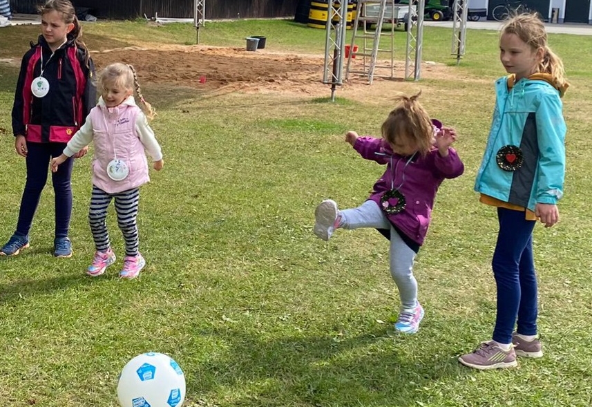 Das Sackhüpfen forderte dann schon etwas Kondition, denn oftmals stolperten die Akteure. Beim Ballbalancieren musste der weiße Ball, den alle zuvor geschenkt bekamen, auf einem Tennisschläger ruhig transportiert werden. Viel Zielgenauigkeit galt es beim Ringewerfen unter Beweis zu stellen, Sandstaffellauf und Torschuss forderten ebenso Geschick und Augenmaß. Dazu war es windig, sodass die Bälle oft verweht wurden und so nicht direkt ihren Weg ins Ziel fanden. Als Belohnung gab es Eis, Getränke und Gummibärchen. Am Ende durften die Kinder noch ihre eigenen Bälle beschriften und damit weiter spielen.
