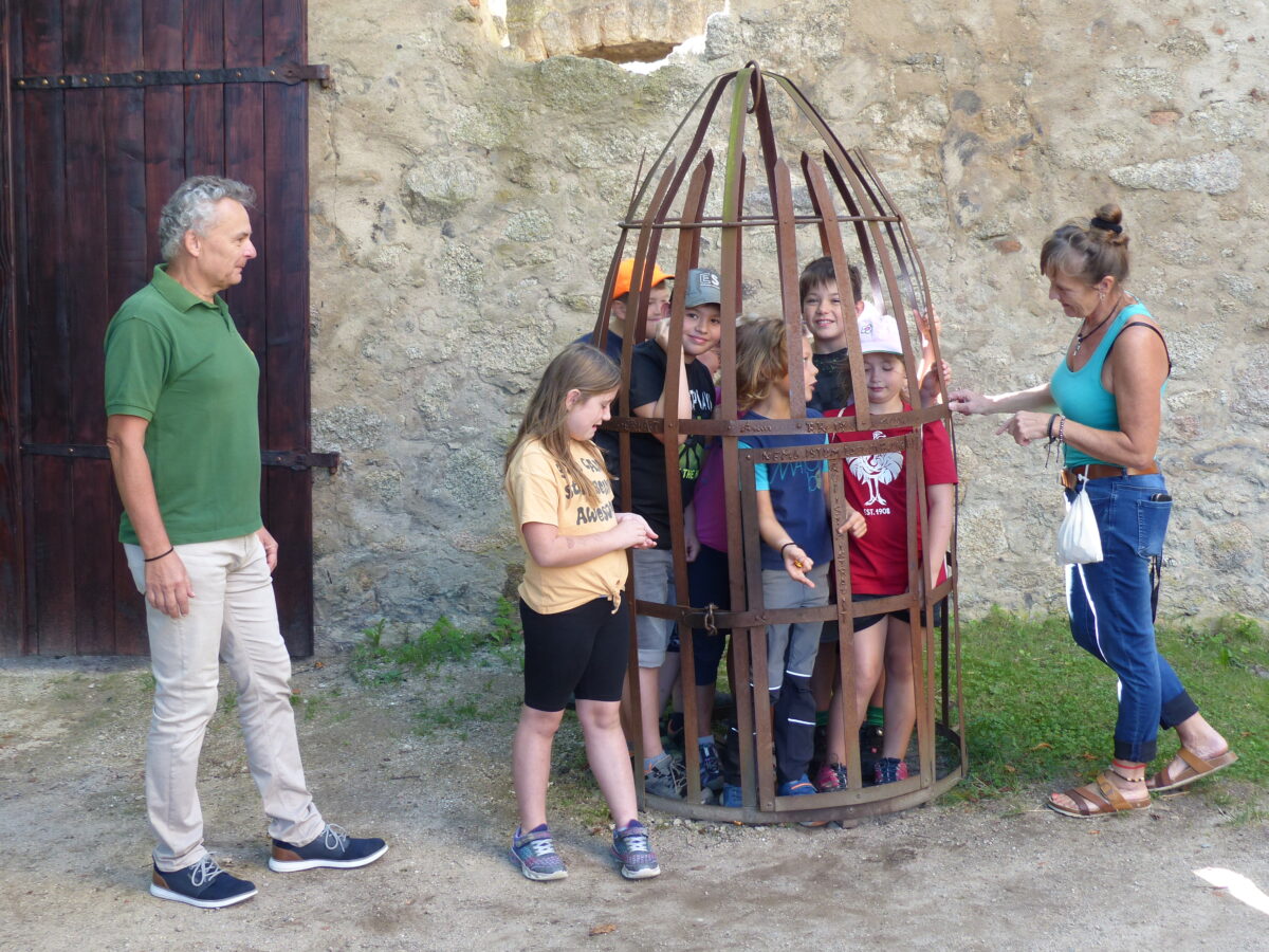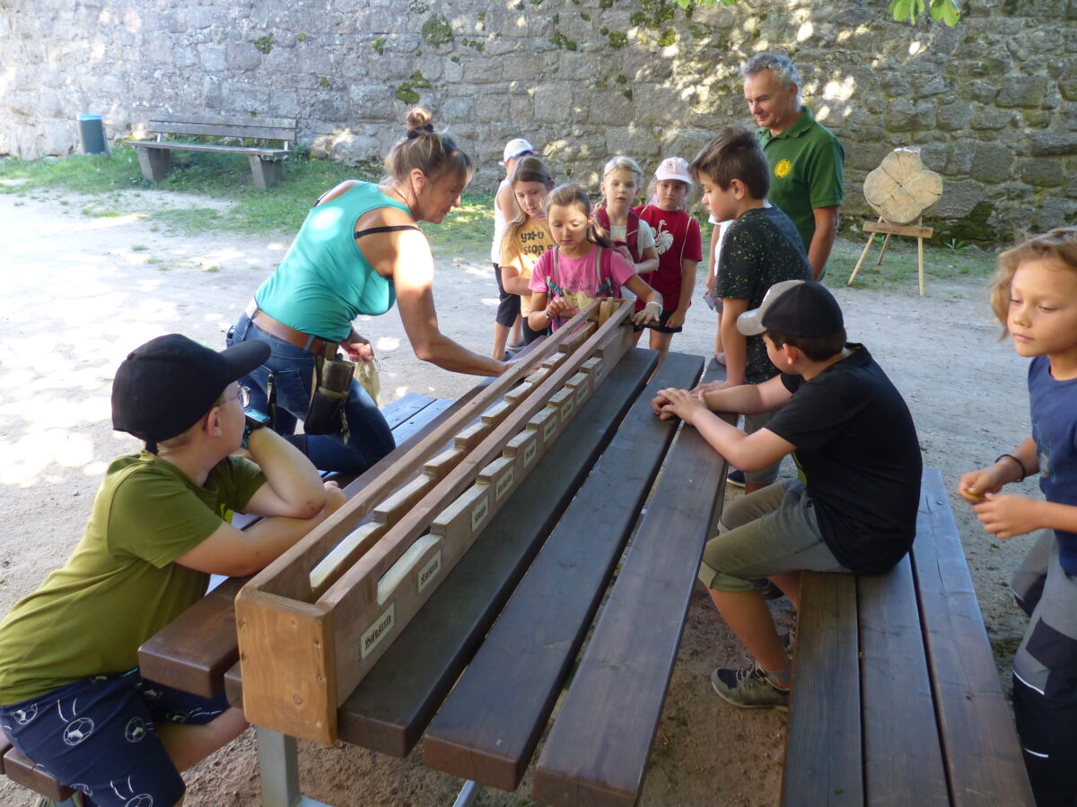Auf der größten Burganlage der Oberpfalz machten sich die Mädchen und Buben mit Burgwartin Rita Lingl auf dem Weg durchs Mittelalter. Sie erzählte die Geschichte der Burg, insbesondere des Burgfräuleins und hatte dabei sehr aufmerksame Zuhörer. Auch stellte sie viele Fragen und war überrascht, wieviel die Kleinen, die aus der gesamten Marktgemeinde gekommen waren, doch schon wussten von der Geschichte der Burg. Die Burgwartin hatte viele Stationen mit den unterschiedlichsten Spielen aufgebaut.