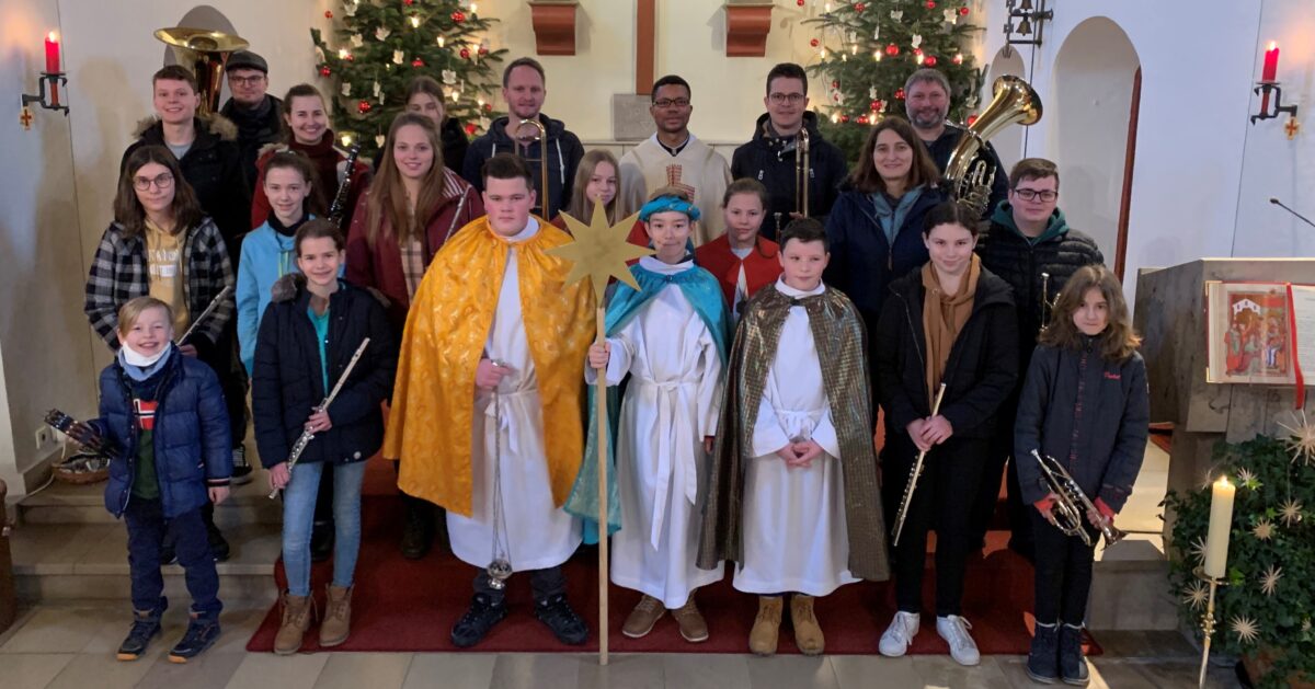 Gleich 16 junge Musikanten und Musikantinnen unter Leitung von Tanja Ritter bewiesen auf der Empore mit ihren Blasinstrumenten ihr musikalisches Können, wobei Lieder zur weihnachtlichen Festzeit zu hören waren. Der Gottesdienst wurde zelebriert von Pfarrvikar Justin Kishimbe mit seinen Ministrantinnen.