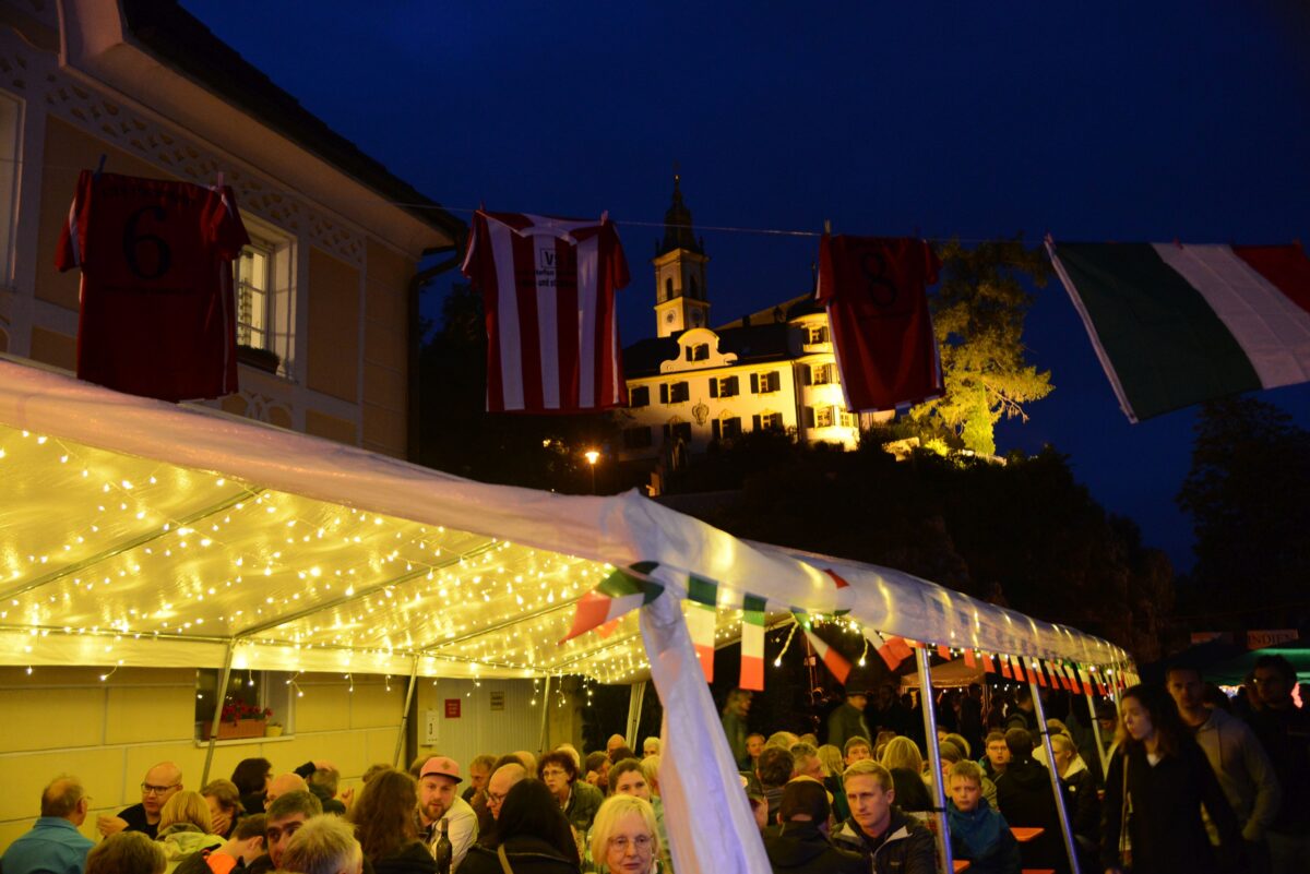 Pleysteins Stadtspitze mit Bürgermeister Rainer Rewitzer und die Zweite Bürgermeisterin Andrea Lang freuten sich wieder Karl Wratschko, Altbürgermeister der Patenstadt Gamlitz, willkommen heißen zu können. Als gegen 20 Uhr der Regen spürbar nachgelassen hatte, füllten sich auch die nicht überdachten Plätze. Von da an dachten die Veranstalter aber schon an den Sonntag mit dem Bürgerfest und hofften auf einen Tag ohne Regen. Bis zum Ende des Abends unterhielten „Die Feiermelder“ die Besucher am Platz vor dem Rathaus.
