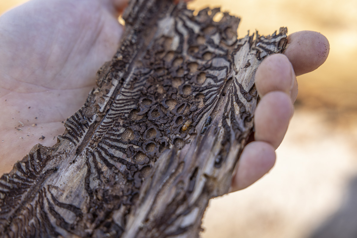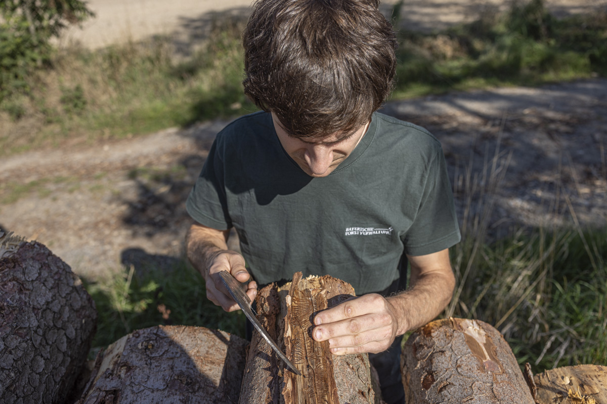 Beim Blick unter die Fichtenrinde kann der Förster schnell den großen Mittelgang ausmachen, den die Elterntiere angelegt haben. “In den kleineren Seitengängen werden die Eier abgelegt. Dort schlüpfen die Larven und fressen sich immer weiter durch die Rinde”, erklärt der Förster. Schon beim ersten Rindenstück findet er mehrere tote alte Borkenkäfer, die durch ihre schwarze Färbung auffallen. Wenige Sekunden später findet er einen hellbraunen Jungkäfer, der kurz vor dem Ausflug steht.
