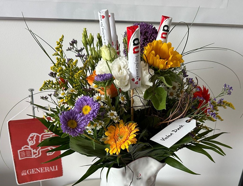 Wenn die Gemeinschaft gelingen soll, komme es laut Pfarrer Bauer letztendlich auf jeden einzelnen an und die gemeinsamen Aktivitäten und Ausflüge in einheitlicher Kleidung stärken den Zusammenhalt. Im Beisein der Geistlichen, der Minis und einigen Eltern übergaben die Spender von Allfinanz die hochwertigen und kuscheligen Sweatjacken und mit einem Vergelts-Gott dankte Pfarrer Bauer im Namen aller. Da die vielen Euros schon vorab die Finanzierung möglich machten, konnten die Ministranten die Jacken gleich freudestrahlend anziehen und sich bei der Hummerfamilie mit einem großen Blumenstrauß bedanken. Zum Abschluß folgte eine Power Point Präsentation in der alles rund ums Mini-Dasein besprochen wurde.