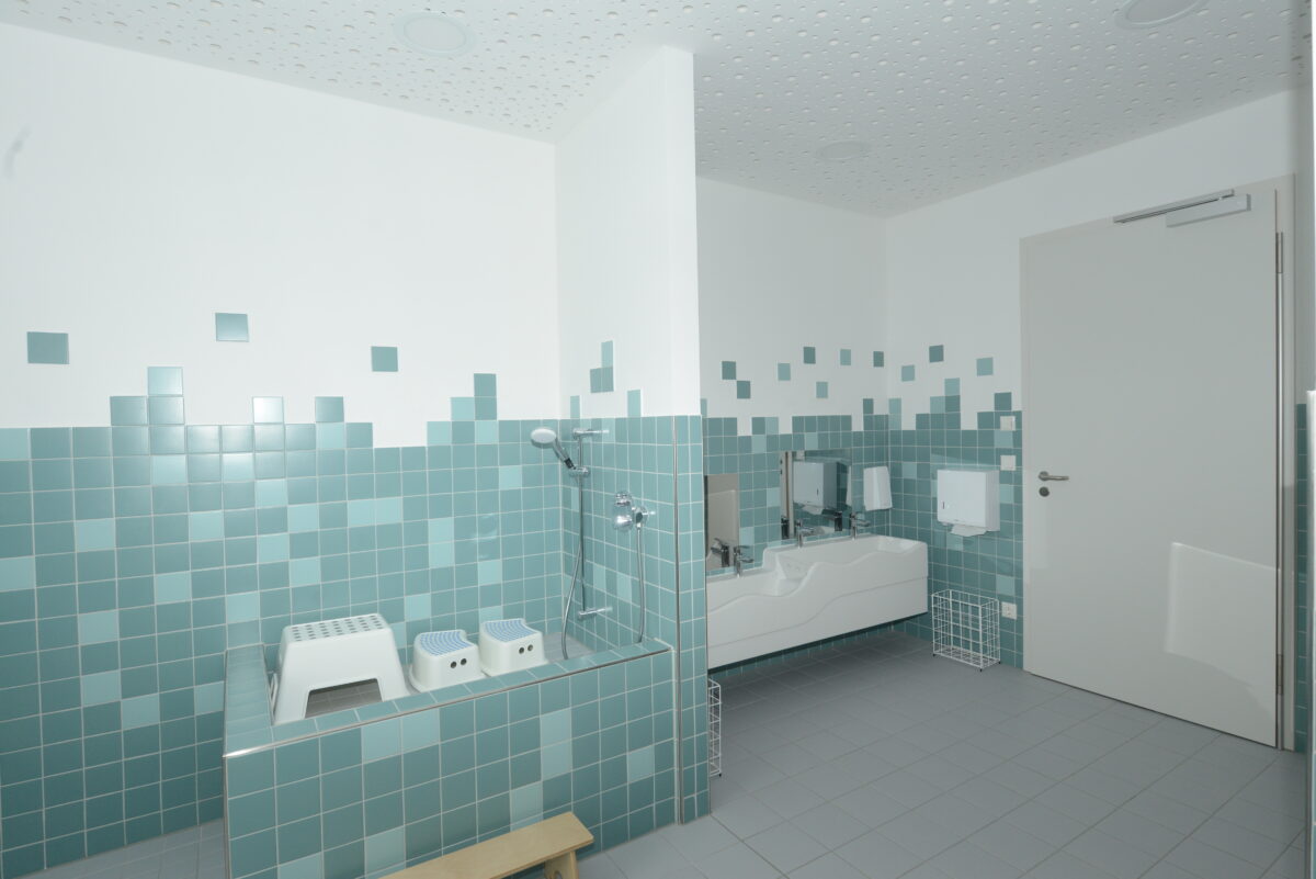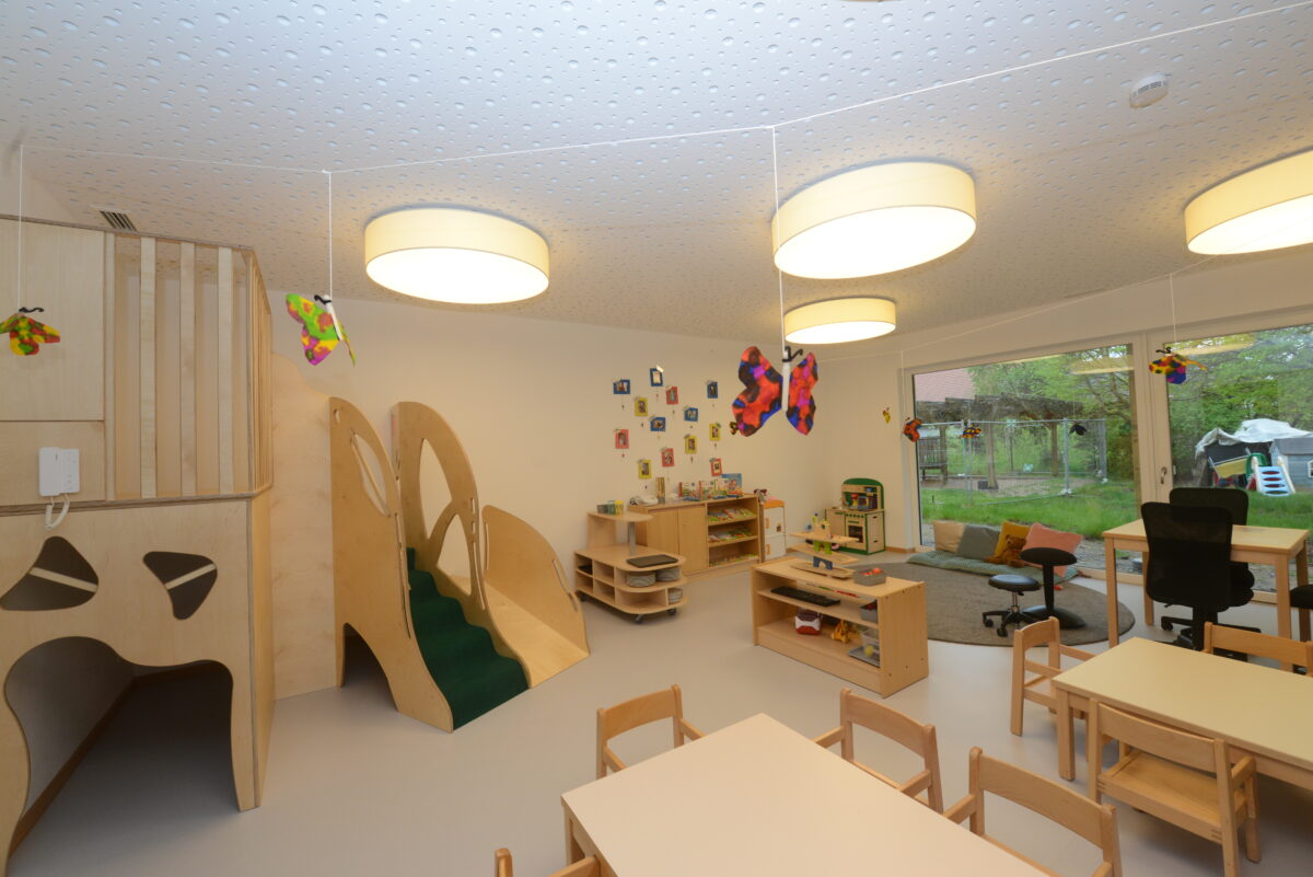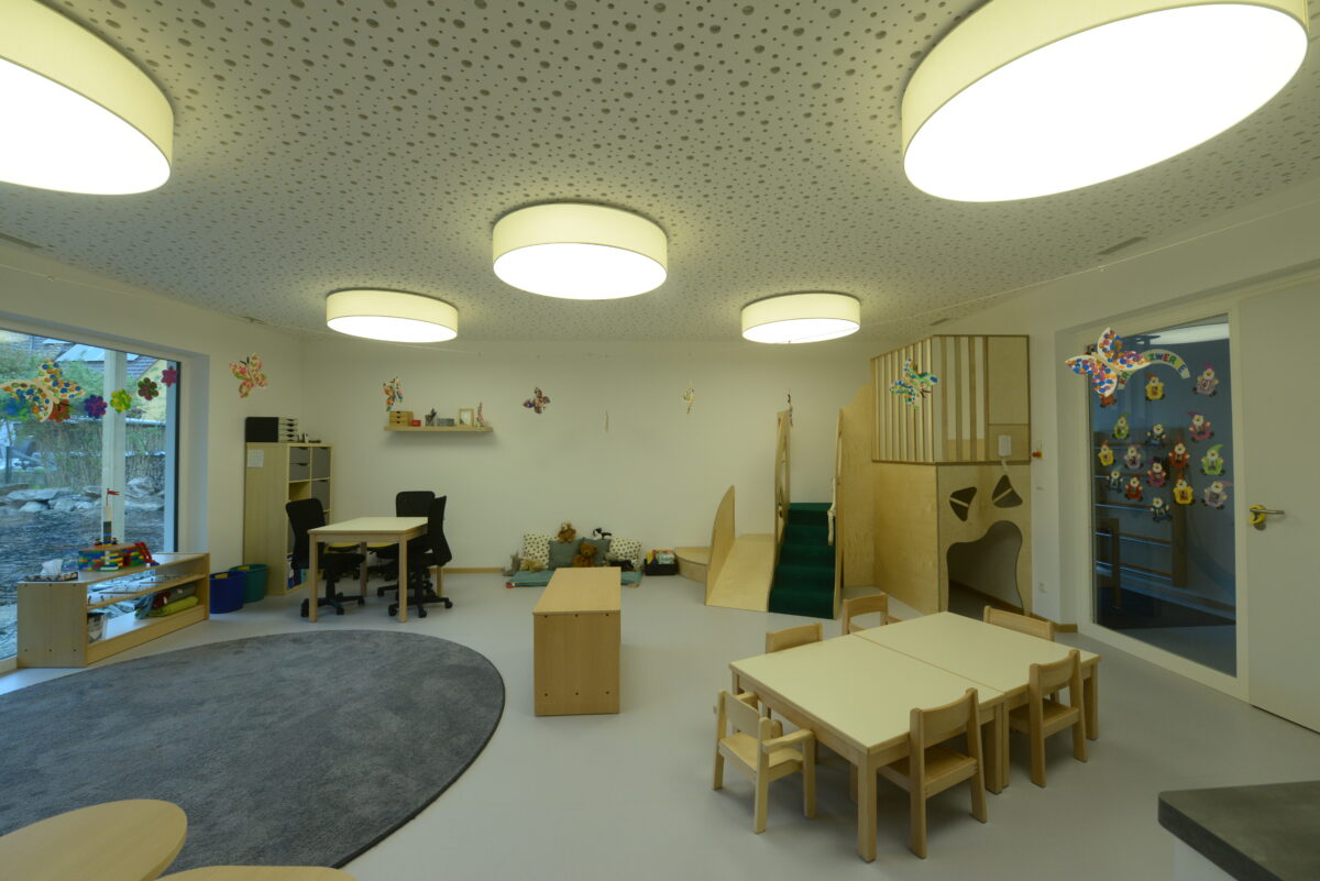 So wurden mit dem jetzigen Erweiterungsbau zwei Gruppenräume, ein gemeinsames Intensivzimmer, zwei Schlafräume, ein Waschraum, eine Küche, ein Behinderten-WC, ein Technikraum und vor allem ein ebenerdig angeordneter Mehrzweckraum geschaffen, der den Verzicht auf Einbau eines Aufzuges im Bestandsgebäude ermöglichte.