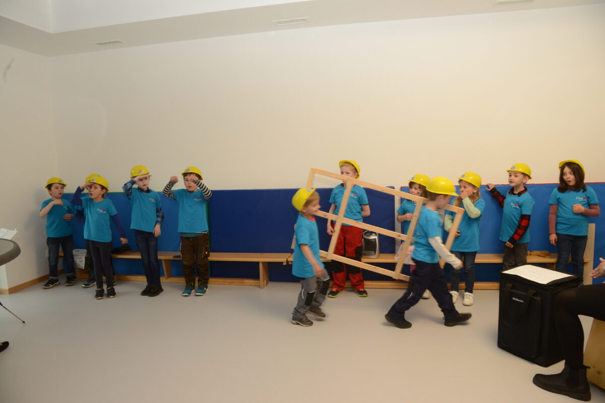 Die Kinder sangen über jeden beteiligten Handwerker ein kleines Loblied und zeigten dazu immer ein wesentliches Bauteil oder Werkzeug des entsprechenden Handwerkszweiges.