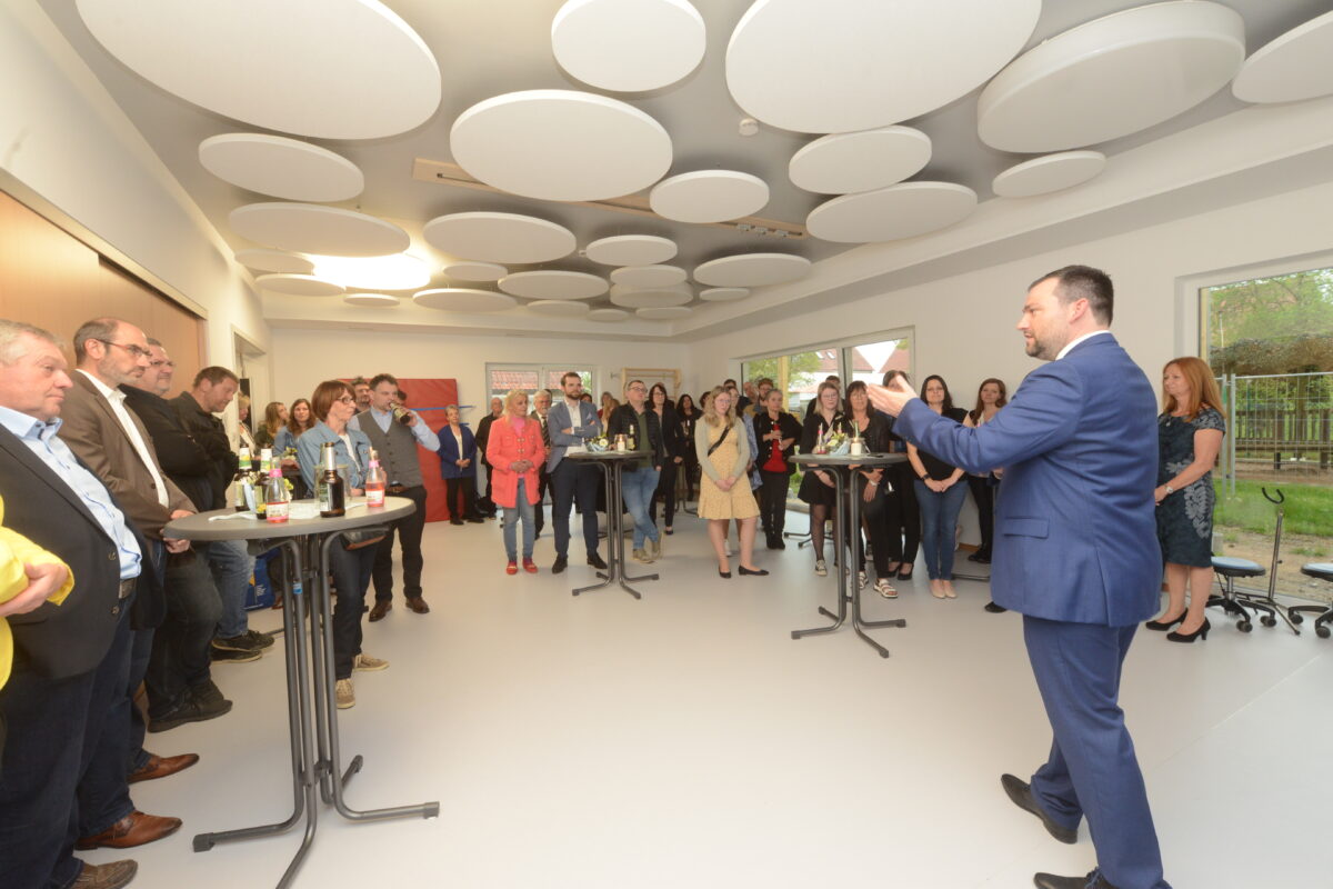Bürgermeister Sebastian Hartl sprach auch zutreffend von einer „spielerischen Übergabe“ des neuen Hauses. Das Marktoberhaupt hob eingangs seiner kurzen Ansprache hervor, dass das Kinderhaus St. Michael im Jahr 2021 vom Markt Luhe-Wildenau übernommen wurde und seither den Namen „Haus der kleinen Hände“ trägt. Passend dazu standen auf den runden Stehtischen kleine Blumengestecke in einem „Händchen aus Porzellan“.