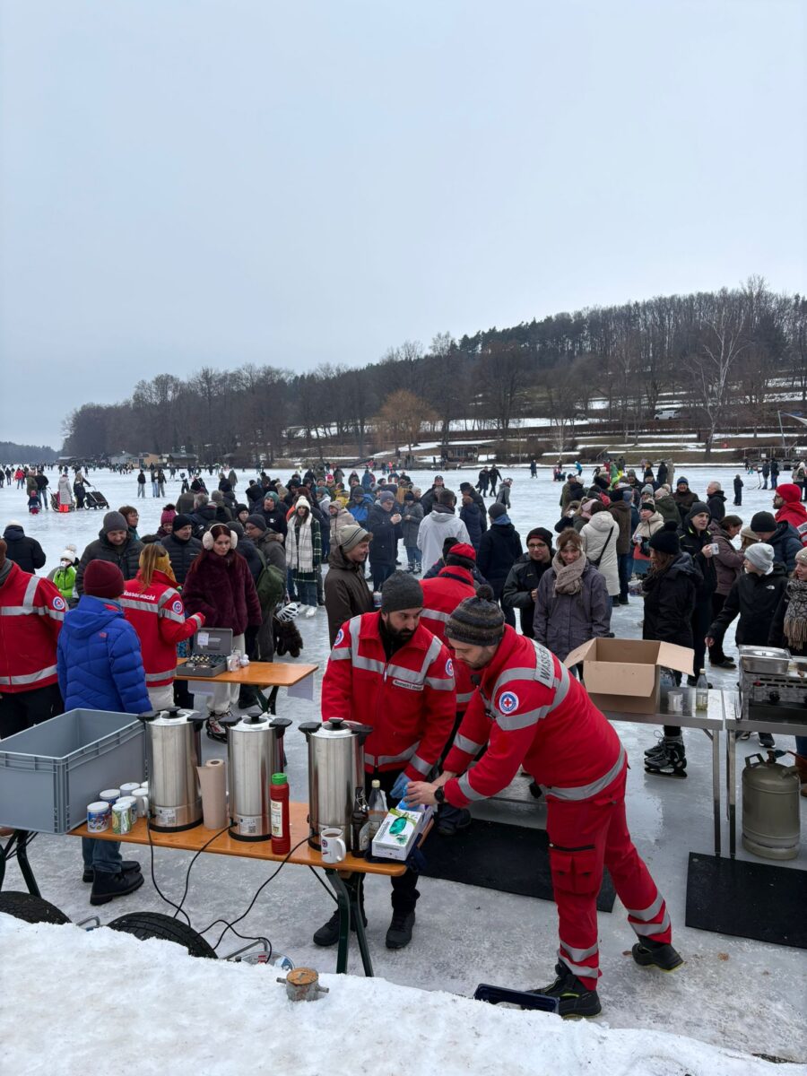 Bei wem sich dann Hunger oder Durst meldete, war bei den Helfern der Wasserwacht bestens aufgehoben. Pausenlos zapften Mustafa und Johanna Glühwein, Punsch und Tee, während Christian, Uwe und Josef bereits nach fast drei Stunden alle Bratwürste ausverkauft hatten. Rund um die Verkaufsstände standen die Menschen zusammen, unterhielten sich und genossen die schöne Atmosphäre. Hoffentlich dauert es nicht wieder neun Jahre bis zum nächsten „Glühwein on Ice“.