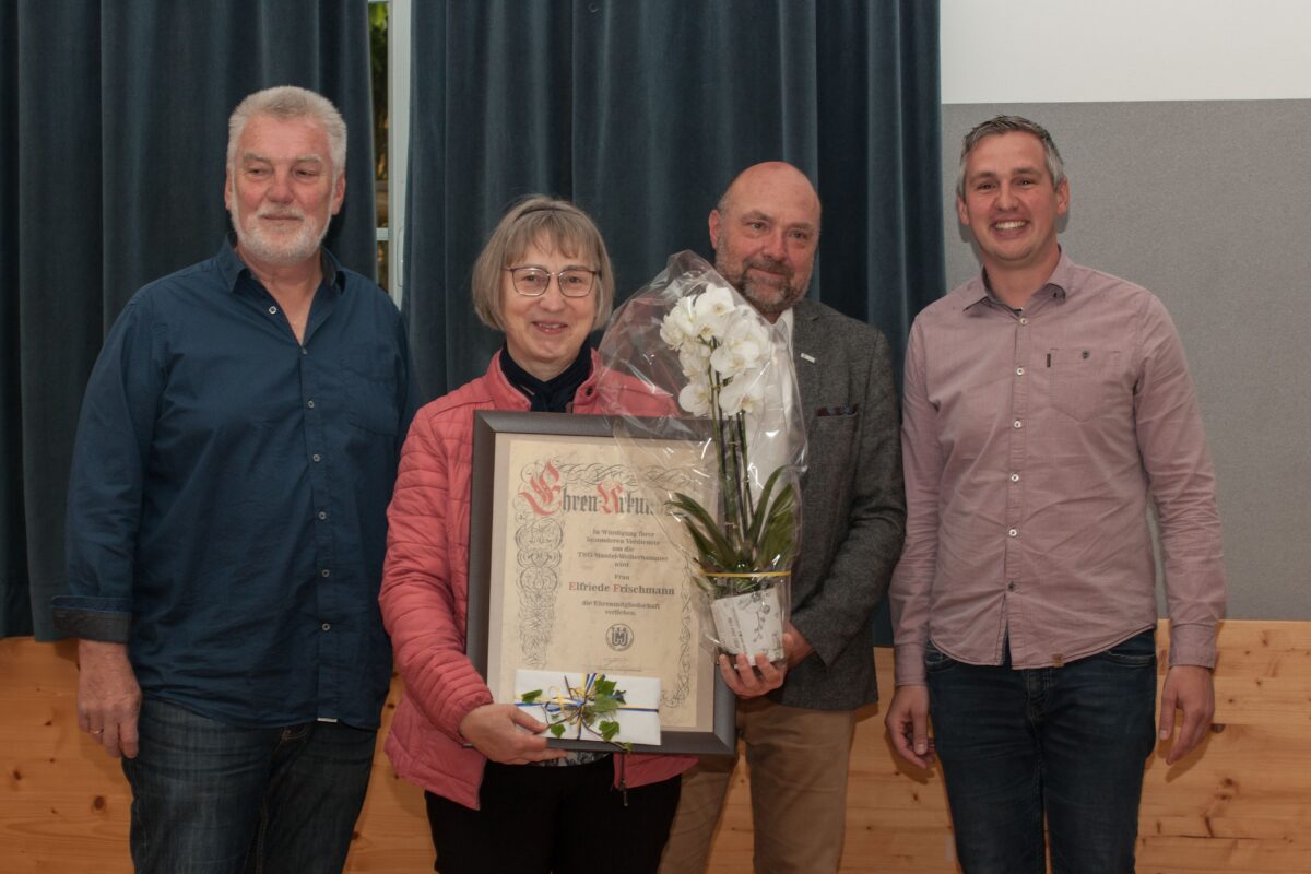 Die Ehrung zum Ehrenmitglied der TSG Mantel Weiherhammer fand unter dem stehenden Applaus der Versammlung statt. Eine sichtlich gerührte Frischmann nahm die Auszeichnung aus den Händen von Heinrich Hildebrand, dem 1. Vorsitzenden, Andreas Solter, dem 2. Vorsitzenden, und Günther Paul, dem BLSV Vertreter, entgegen. Diese Ehrung verkörpert die hohe Achtung und den tiefen Dank des Vereins für Frischmanns jahrzehntelanges Engagement und ihre beispiellose Hingabe.