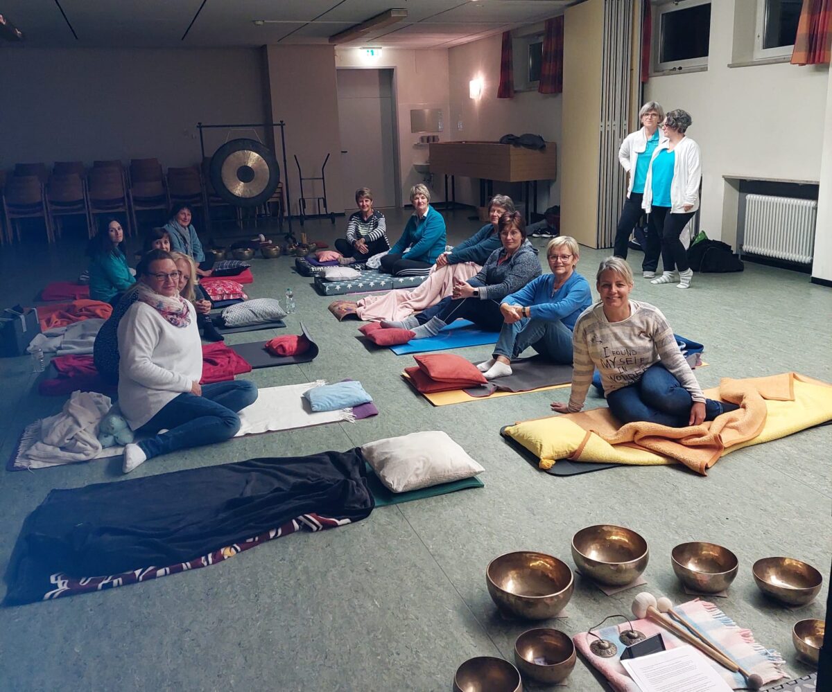 Neben den Teilnehmerinnen freute sie sich, die beiden Referentinnen Doris Popp (Heilpraktikerin) sowie Kerstin Hörl (Gesundheitspraktikerin) im kleinen Saal des Jugendheims begrüßen zu dürfen. Gut gebettet auf weichen Unterlagen und mit Decken versorgt erlebten die Teilnehmerinnen ein besonderes Klangerlebnis mit verschiedenen Klangschalen und einem großen Gong. Die Schwingungen der obertonreichen Klangschalen schaffen eine meditative Stimmung und wirken auf Körper, Seele und Geist entspannend und beruhigend. Claudia Wolf bedankte sich abschließend für das beeindruckende Erlebnis bei den beiden Referentinnen.