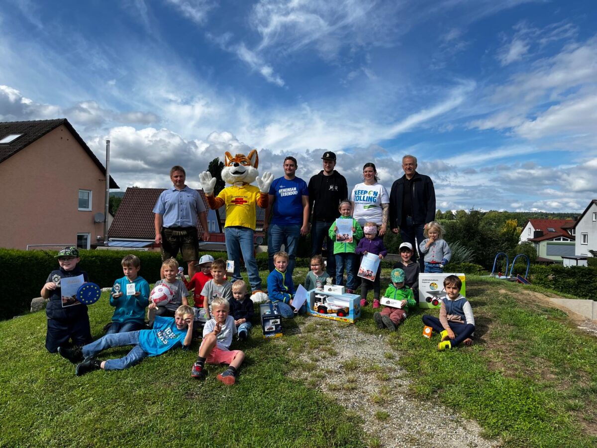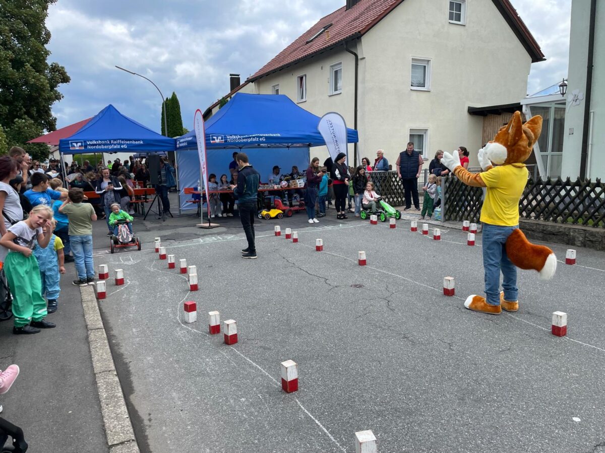 Für gute Stimmung sorgte auch wieder der Bausparfuchs der Volksbank Raiffeisenbank Nordoberpfalz. Das Maskottchen war ein beliebtes Fotomotiv und stand den jungen Fahrerinnen und Fahrern mit Anfeuerungen zur Seite. Alle Kinder erhielten als Anerkennung eine Urkunde sowie hochwertige Sachpreise, die von örtlichen Unternehmen gestiftet wurden. Die jeweils drei Bestplatzierten durften sich außerdem über einen exklusiven Pokal freuen. Die Siegerehrung übernahm der Organisator und Moderator der Rennen, Matthias Fütterer, gemeinsam mit Landrat Roland Grillmeier, der Zeit fand, das Spielplatzfest zu besuchen.
