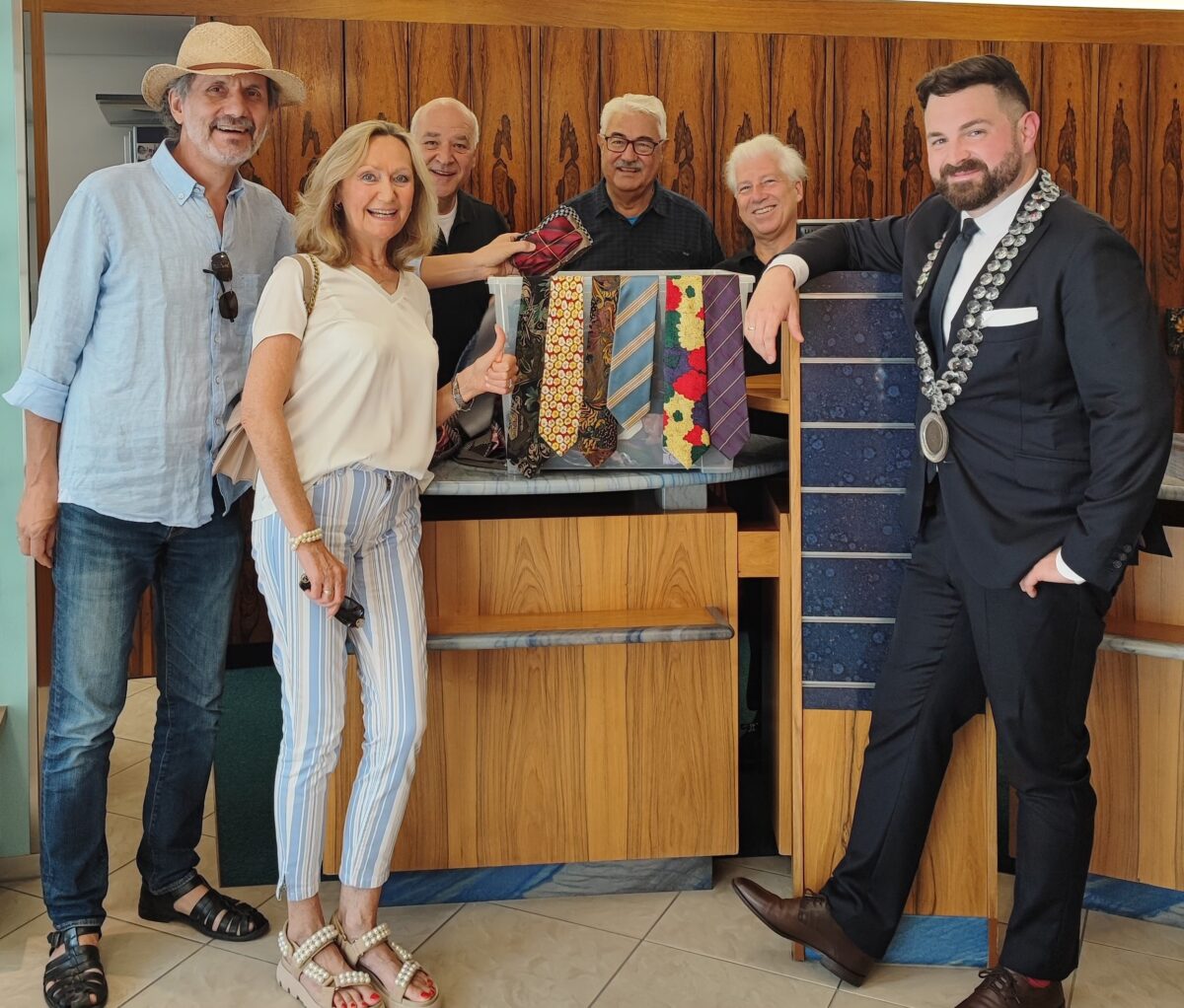 Der Lionsclub mit seinem Präsidenten Sebastian Denzler und die Initiatoren Karin Birkner und Christian Kick freuten sich, dass die Aktion so gut angenommen wurde. Den ganzen Nachmittag über, auf dem Weg zum oder vom Bürgerfest, wurden Krawatten gebracht.