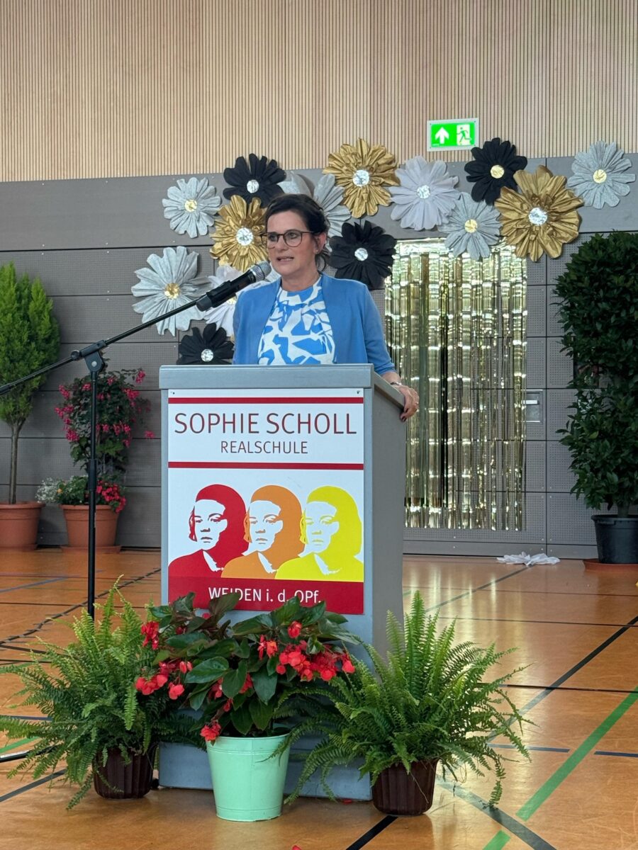 Realschuldirektorin Susanne Genser griff in ihrer Rede das Thema Blumen auf und verglich die Absolventinnen mit Pflanzen, die in den vergangenen sechs Jahren an der Sophie-Scholl-Realschule gehegt und gepflegt wurden. Durch die Gabe von Dünger und Wasser, aber auch durch gelegentliches Umtopfen, konnten nun am Ende ihrer Zeit an der Sophie die Pflanzen sinnbildlich zum Blühen gebracht werden und sind nun bereit, einen weiteren Abschnitt in ihrem Leben anzutreten.
