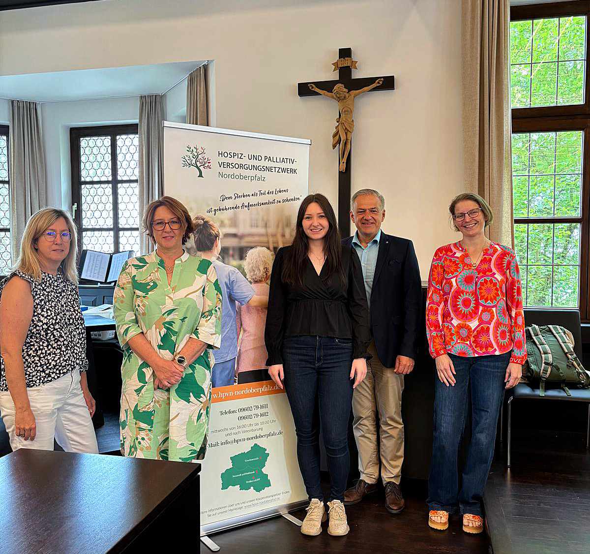 (von links) Doris Wagner-Zeeh (Gesundheitsamt Tirschenreuth), Frances Mathews (Pflegefachkraft MSc., Palliativstation am Klinikum Weiden) Daniela Peintinger von der Gesundheitsregion plus Nordoberpfalz, Landrat Roland Grillmeier und Dr. Stephanie Kuchlbauer (Chefärztin der Palliativstation am Klinikum Weiden). Foto: LRA Tirschenreuth
