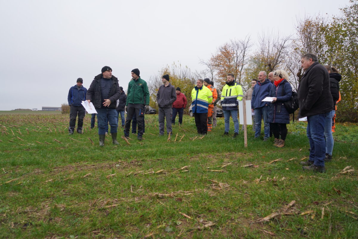 Untersaaten haben zudem noch viele weitere positive Eigenschaften, wie zum Beispiel die Verminderung der Bodenerosion und die Verbesserung der Bodenfruchtbarkeit. Zum Vergleich ist eine sog. Nullparzelle ohne Pflanzenbewuchs in den Versuch mit integriert. Erste Ergebnisse zeigen, dass der Nitratgehalt im Boden durch den Anbau einer Untersaat gesenkt werden kann. Interessierte aus dem Bereich Etzgersrieth und Eslarn verfolgten die Ausführungen der Experten.