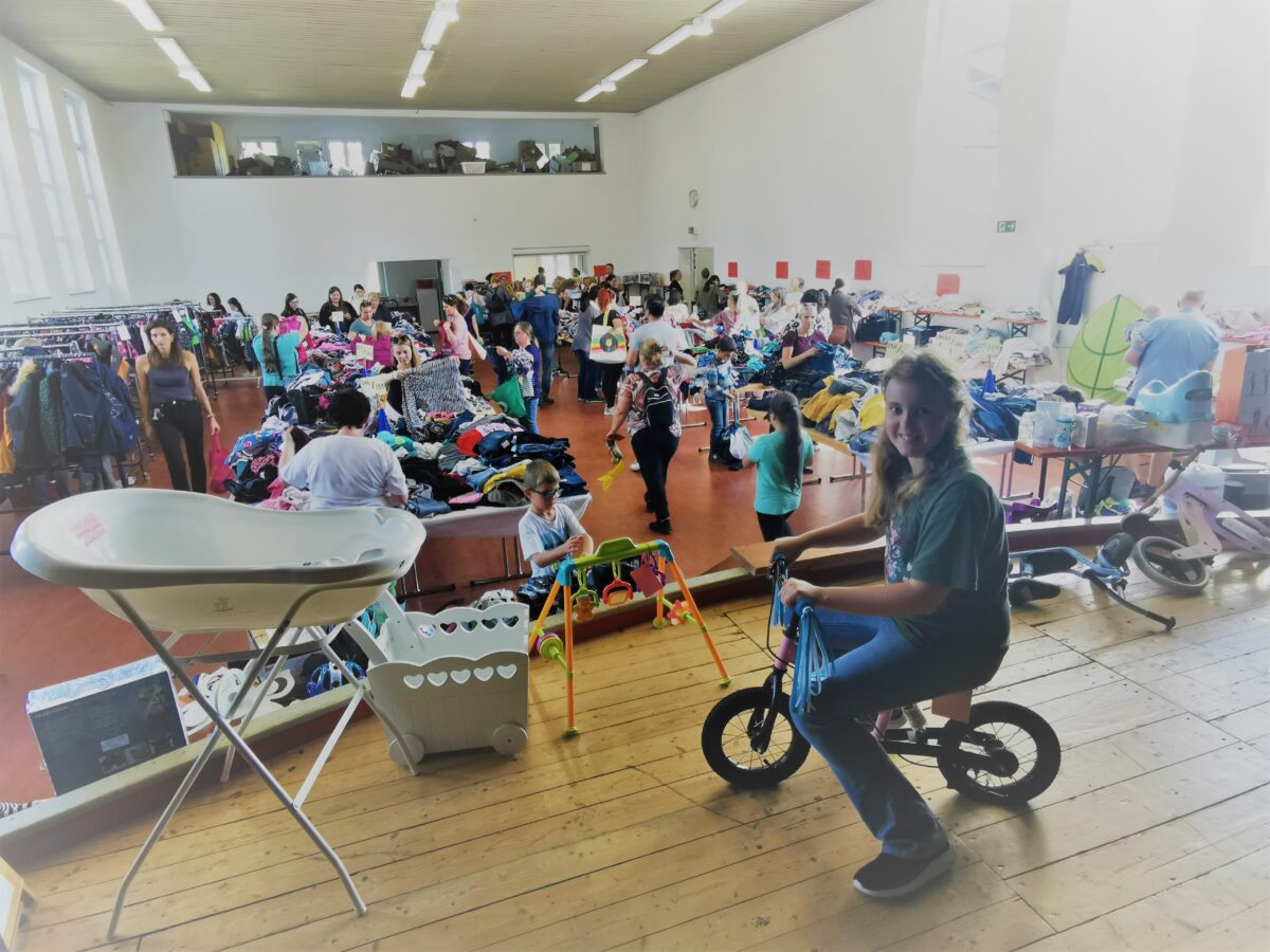 In der Spielzeugabteilung versammelten sich überwiegend die jüngeren Besucher und im Turnsaal suchten die Eltern passende Kindersachen. Da kein größeres Zweirad da war, vergnügte sich die zehnjährige Emma Lindner mit einem kleineren Exemplar. Die junge Dame packte mit ihren Eltern fleißig mit an. Die potenziellen Kunden kamen nicht nur aus den Landkreisen Neustadt/WN und Schwandorf, sondern auch aus Tschechien.