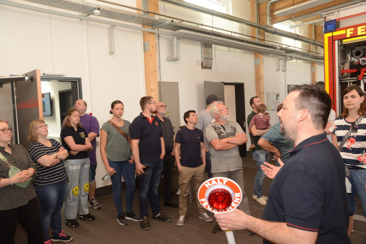 Bürgermeister Sebastian Hartl, welcher selbst noch im aktiven Feuerwehrdienst ist, übernahm die Führungen. Er begann seinen Rundgang sinnvollerweise am Haupteingang, durch den auch Wehrmitglieder beim Einsatz „stürmen“, um fast hinter der Tür ihre Einsatzausrüstung anzulegen. Von dort aus führte der Weg in die Fahrzeughalle. Fachmännisch erläuterte das Marktoberhaupt die bau- und sicherheitsrechtlichen Vorgaben, die beim Bau des Feuerwehrhauses zu berücksichtigen waren. Junge Feuerwehrdamen boten den Besuchern den Ausdruck eines Datenblattes ihres Fahrzeuges an, das im Fahrzeug hinter der Sonnenblende befestigt werden soll, um bei einem möglichen Notfalleinsatz den Einsatzkräften Hinweise auf die Technik des Fahrzeuges zu geben.