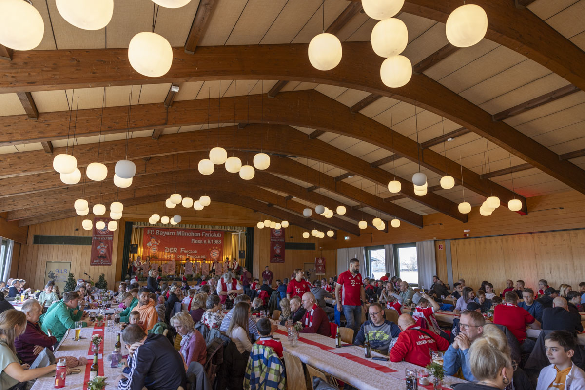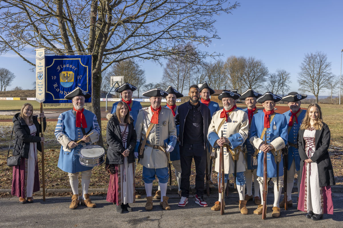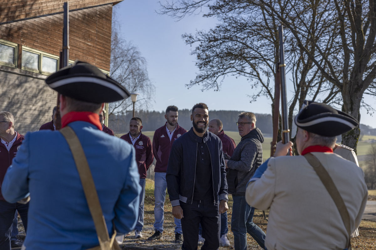 Mit Salutschüssen der Flosser Landwehr wird der Profikicker vor der Halle in Empfang genommen. Danach eine kleine Stärkung. Doch die Küchencrew des Fanclubs muss kurzfristig umdisponieren. Ein Schweineschnitzel hätten sie dem Gast in die Pfanne gehauen. Doch Choupo-Moting winkt ab. Schwein mag er nicht. Aber die Putenfleisch-Alternative lässt er sich schmecken. Mit dem Defiliermarsch zieht er dann in die vollbesetzte Halle ein. Fanclub-Vorsitzender Stadler nutzt die Gelegenheit, um die Höhepunkte in der 35-jährigen Geschichte des Flosser Vereins Revue passieren zu lassen.