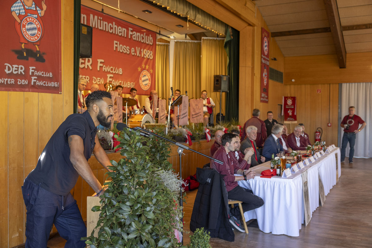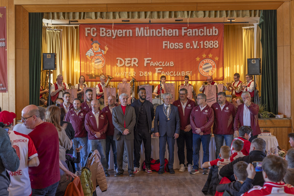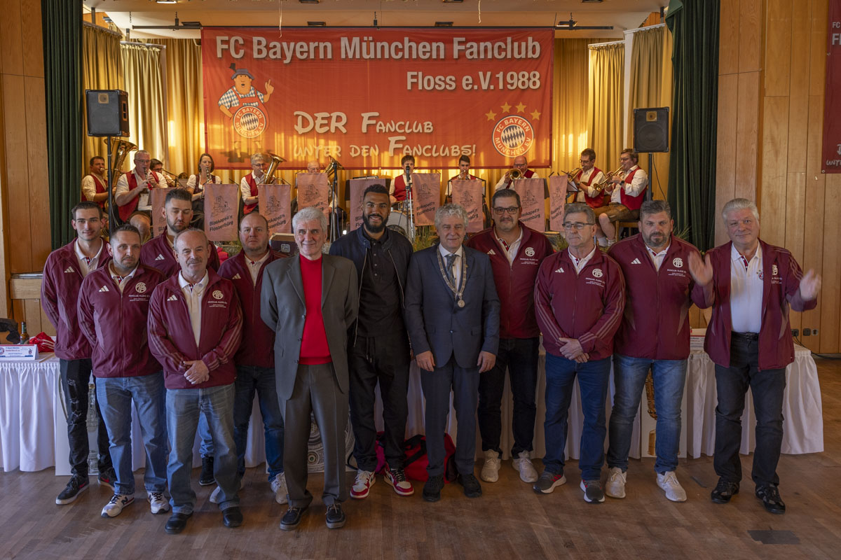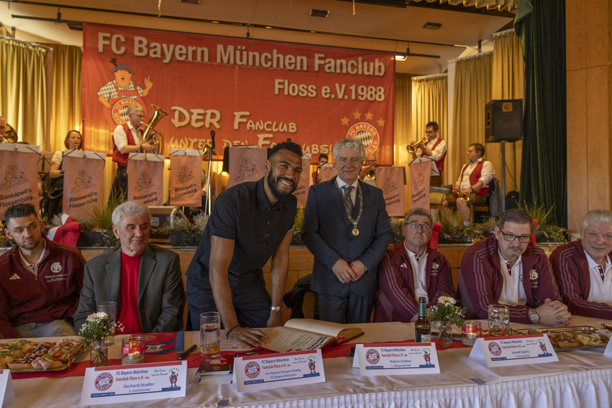 Großer Bahnhof für einen Großen. Mit allen Flosser FC Bayern-Fanclub-Ehren wird Eric Maxim Choupo-Moting in der Mehrzweckhalle der Marktgemeinde willkommen geheißen. 1,91 Meter misst der sympathische Fußballer. Er ist mittlerweile der 15. Kicker beziehungsweise Repräsentant des deutschen Rekordmeisters, den der Fanclub-Vorsitzende Gerhard Stadler willkommen heißen kann.
