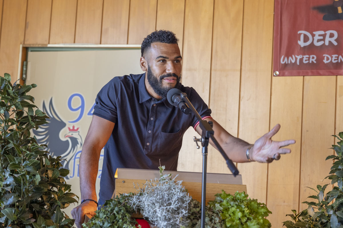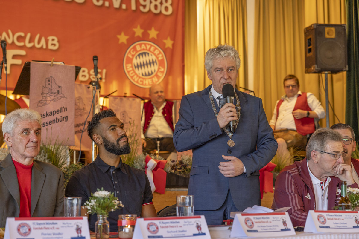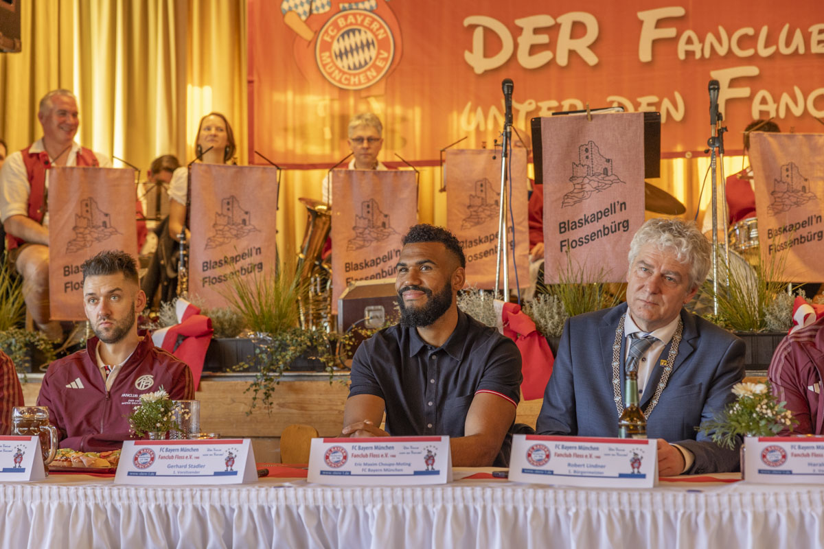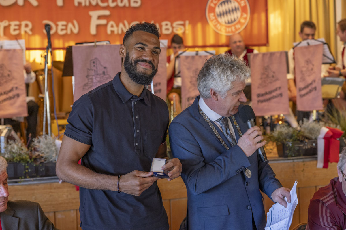 Großer Bahnhof für einen Großen. Mit allen Flosser FC Bayern-Fanclub-Ehren wird Eric Maxim Choupo-Moting in der Mehrzweckhalle der Marktgemeinde willkommen geheißen. 1,91 Meter misst der sympathische Fußballer. Er ist mittlerweile der 15. Kicker beziehungsweise Repräsentant des deutschen Rekordmeisters, den der Fanclub-Vorsitzende Gerhard Stadler willkommen heißen kann.