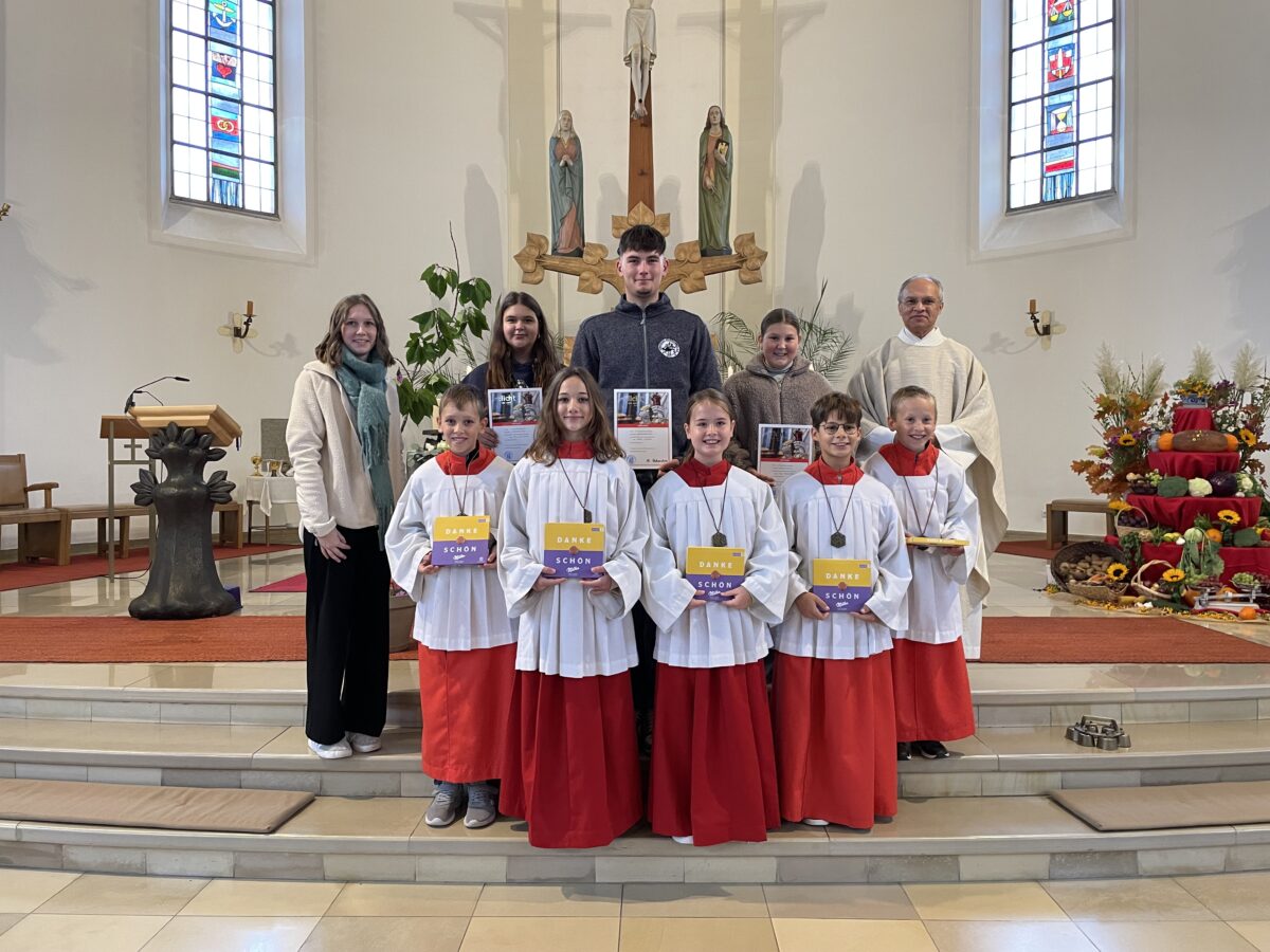 Im Zuge des Gottesdienstes wurden fünf neue Ministranten vorgestellt und langjährige Ministranten verabschiedet. Die neuen Ministrantinnen und Ministranten wurden feierlich in die Gemeinschaft aufgenommen. Neu im Dienst sind (von links) Andreas Aigner, Martha Siebert, Theresa Schusser, Jakob Lehnert, Maximilian Säckl, verabschiedet wurden (von links) Pia Linsmeier, Leon Kiener und Mia Melischko sowie (nicht auf dem Bild) Toni Wolfram und Luca Melischko. Lisa Ziegler dankte allen herzlich für ihren Einsatz und ihren Dienst am Altar.