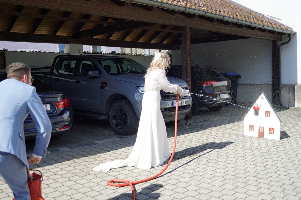 Während Jonas sich ehrenamtlich als Jugendwart bei der Feuerwehr engagiert, steht Jennifer regelmäßig auf der Bühne – in der katholischen Theatergruppe Grafenwöhr. Diese Gruppe sorgte auch bei der standesamtlichen Trauung für einen besonderen Moment und inszenierte kurzerhand eine humorvolle kirchliche Zeremonie.